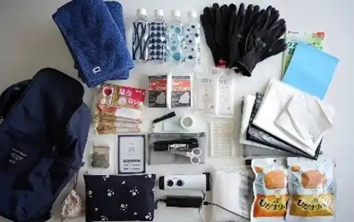 LEDライト/家族分の水/千円札と小銭/絆創膏/食料品/モバイルバッテリー/口腔ケア用品/カイロと冷却バッグ/除菌シート/ウェットティッシュ/緊急連絡先一覧表/衛生セット/文具セット/ケガ防止セット&防寒セット |