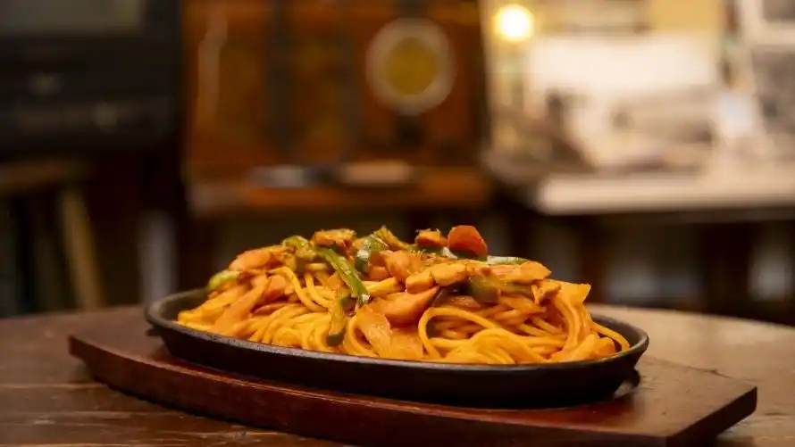 やや太めのパスタに、たまねぎ・ピーマン・ウインナーの定番具材をバターで炒め、ケチャップの甘味と酸味、ソースの旨みを引き立てました。 |