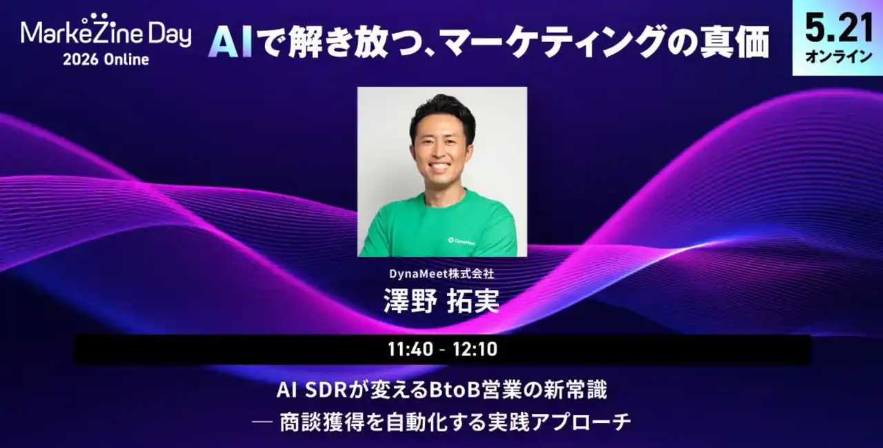 AI商談獲得プラットフォーム「Meeton ai」を開発・提供するDynaMeet株式会社(所在地:東京都渋谷区、共同代表:Ayan Ray/澤野拓実)は、2026年5月21日(木)に株式会社翔泳社が主催するオンラインイベント「MarkeZine Day 2026 Online」において、当社共同代表 兼 CRO 澤野拓実が【S-3】セッション(11:40~12:10)に登壇することをお知らせいたします。 |