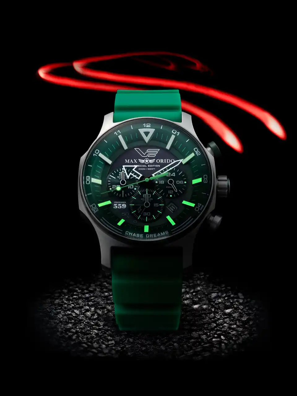MAXORIDO 559がガラス裏面にプリント と CHASE DREAMSの文字は、ベゼル部にプリントされている |