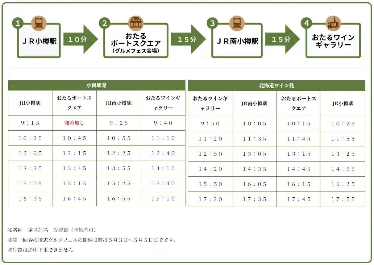 | ※往路(JR小樽駅~おたるワインギャラリー)間でご乗車のお客様は、終点おたるワインギャラリーまで途中下車できませんので、あらかじめご了承ください。 | |||