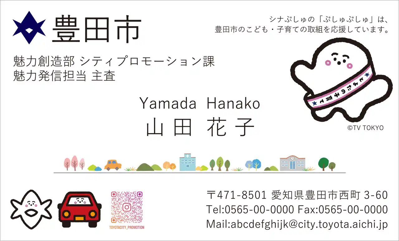 | オープニングセレモニーでは、今回のためにデザインされた「豊田市の市章の形に変身したぷしゅぷしゅ」と「応援大使のタスキをかけたぷしゅぷしゅ」が使用されたタイアップアイコンがお披露目されました。このアイコンは今後、市のホームページや啓発物、職員の名刺、事務封筒など、市民の方々の目に多く触れる様々な場所やモノに活用される予定です。 | |||