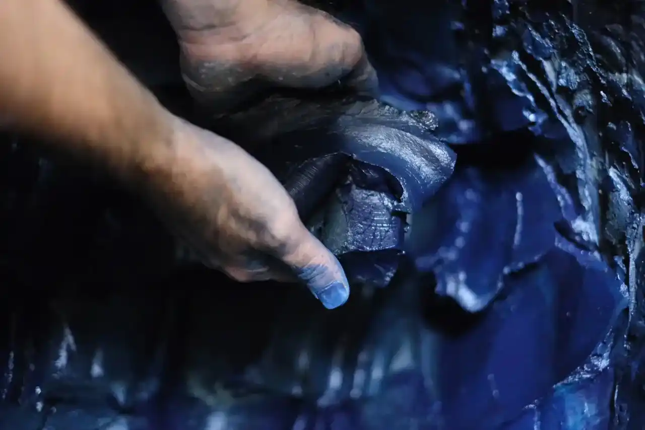 これまで藍は「染めるもの」として扱われてきましたが、素材として捉えたとき、まだ多くの可能性があると感じています。 特に沈殿藍は粒子としての個性が強く、扱いが難しい一方で、他にはない質感を生み出す力があります。 |