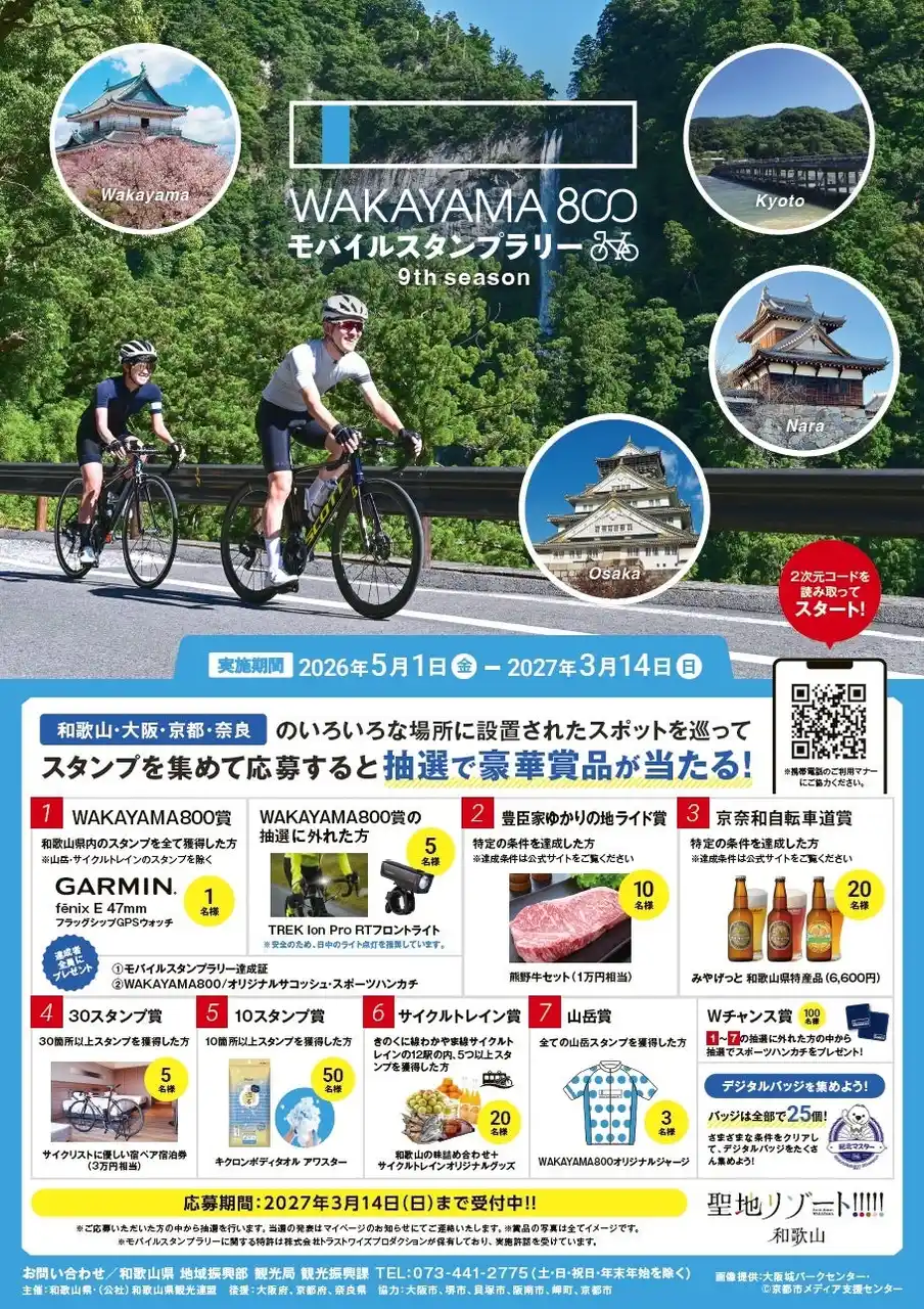 和歌山県 地域振興部 観光局 観光振興課(所在地:和歌山県和歌山市小松原通1-1)は、和歌山県内 800kmを超えるサイクリングルート「WAKAYAMA800」を舞台に、スマートフォンで参加できる周遊企画「WAKAYAMA800モバイルスタンプラリー 9th season」を、2026年5月1日(金)から2027年3月14日(日)まで開催します。 |