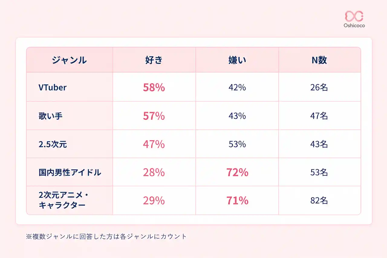 この調査では、VTuber・歌い手推しは「好き」が約6割であるのに対し、国内男性アイドル・2次元推しは「嫌い」が7割超えという対照的な結果となりました。 |