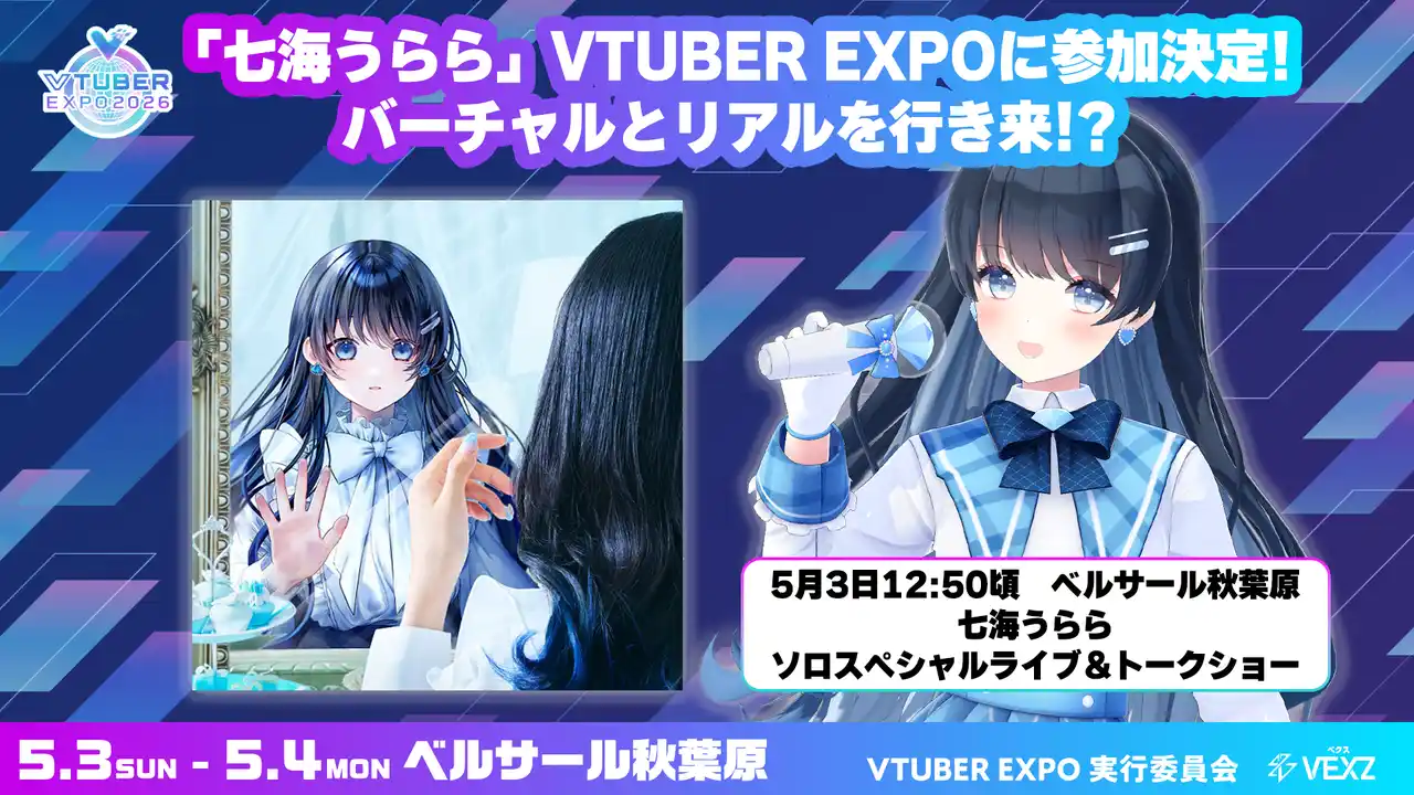 音楽系クリエイターエージェンシー『muchoo(読み:ムチュー)』のパラレルシンガー『七海うらら』のVTUBER EXPOへの出演が決定しました。リアルとバーチャルを行き来する彼女の、パラレルショーを体験できるソロスペシャルライブ&トークショーを開催いたします。七海うらら氏の出演は、2026年5月3日(日)12:50開始 を予定しております。 |