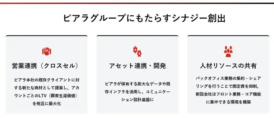 今後は、ピアラグループが有するデータ・基盤・マーケティング支援機能と、A Better Caseが担うブランドコミュニケーション設計、クリエイティブチームの組成機能を掛け合わせることで、企画・制作、認知形成、獲得、LTV向上までを一気通貫で支援する体制を強化してまいります。ブランドをつくることと、成果をつくること。その両方に本気で向き合いながら、ピアラグループはこれからも「よいほうへ。」進んでまいります。 |