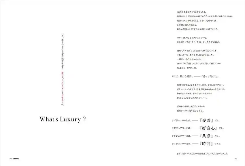 | クワイエットラグジュアリーという言葉が出てきて久しいですが、現代における「Luxury」とは何か?をOCEANSなりに再定義しています。 | |||||||||||||||