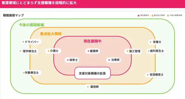 現在は看護師・保育士・治療家の3職種をすでに展開しており、今後は支援領域を着実に広げていきます。看護・保育・治療領域に加え、介護分野では慢性的な人材不足と定着課題が続いており、施工管理領域でも担い手不足や採用難が深刻化しています。さらに、物流やリハビリ関連職種、栄養・医療周辺職種においても、人材確保へのニーズは今後一段と高まることが見込まれます。 |