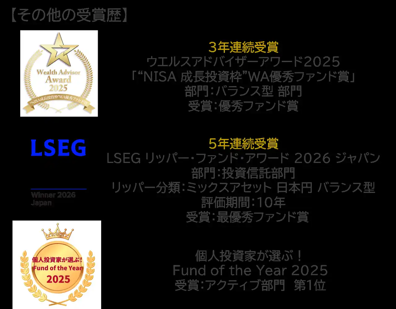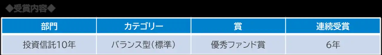 当ファンドは、投資信託証券を通じて、株式と債券を50:50の比率で組み合わせ、国際分散投資することにより、株式保有のリスクを抑え、長期で安定したリターンの獲得を目指します。株式と債券の比率が50:50から一定以上乖離した場合にはリバランスを通じて、目標とする資産配分比率を維持しています。こうした運用のもと、R&Iファンド大賞において6年連続で受賞したものと受け止めております。 |