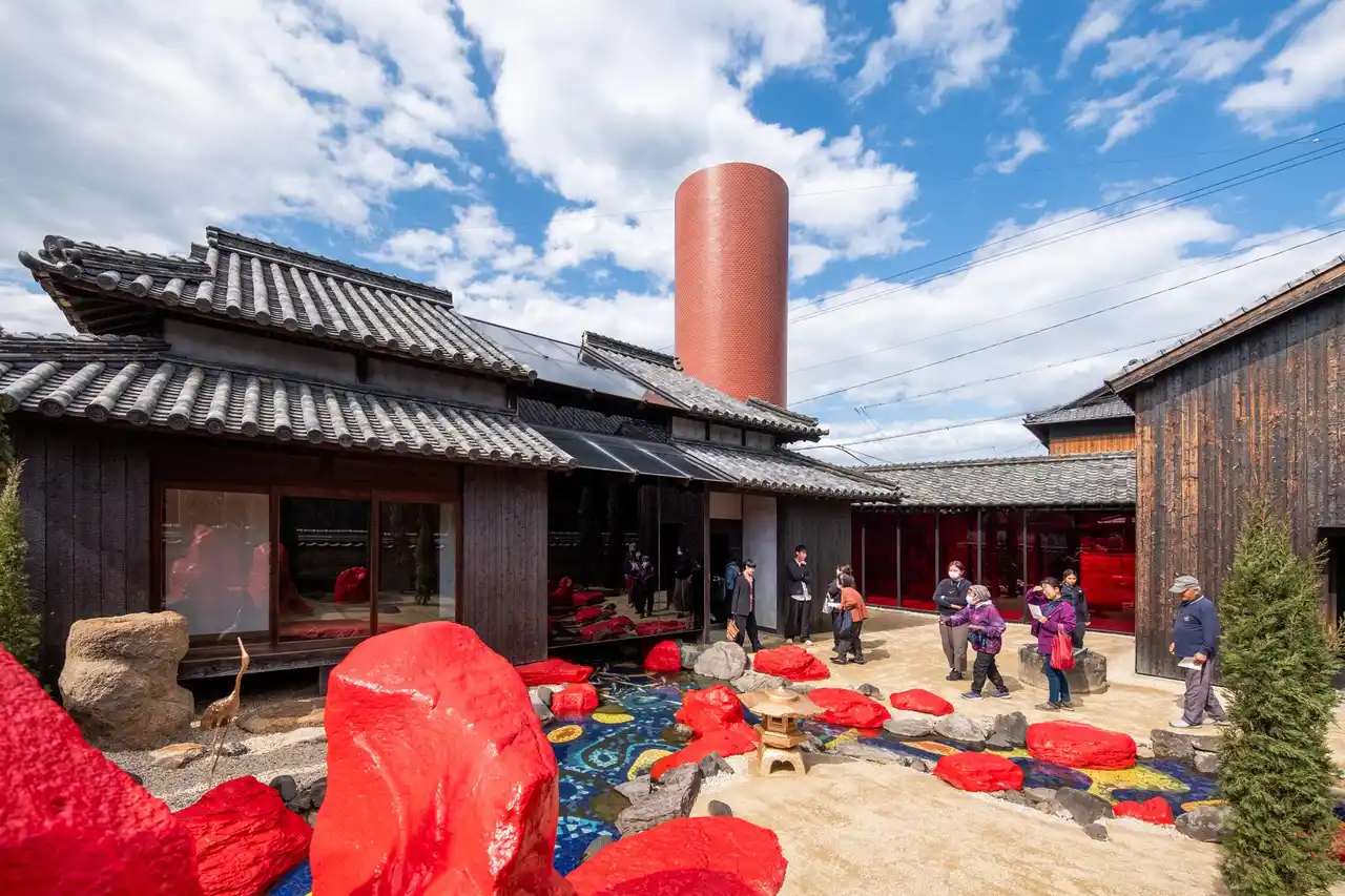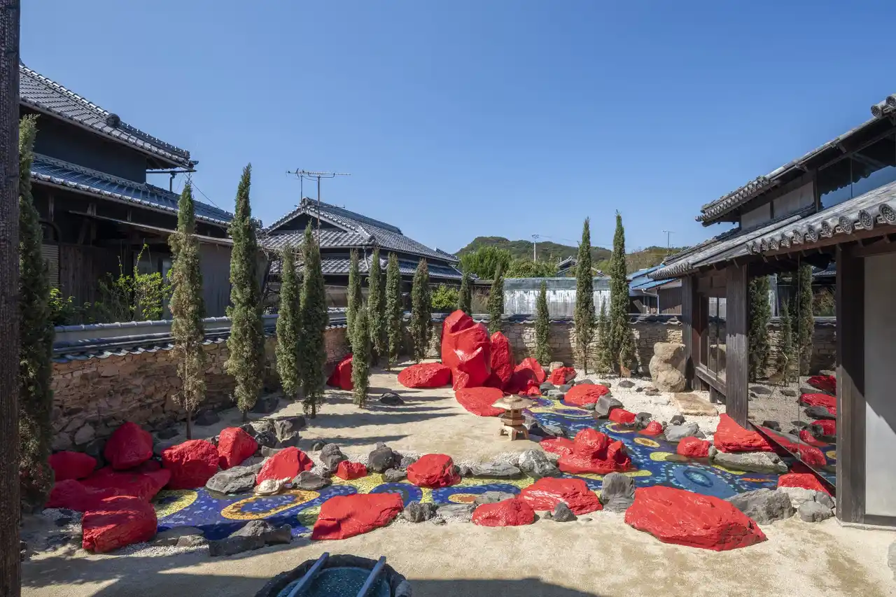 アーティスト・横尾忠則が全体コンセプトを手掛けた「豊島横尾館」は、豊島の玄関口となる港に面した家浦地区の、集落にある古い民家を改修してつくられました。展示空間は、既存の建物の配置を生かして「母屋」「倉」「納屋」で構成され、平面作品11点を展示しています。また、石庭と池、円筒状の塔にはインスタレーションが展開され、作品空間は敷地全域にシンボリックな拡がりをみせます。その空間は、生と死を同時に想起させる哲学的な場となり、さらに、建物には光や色をコントロールする色ガラスを用いて、豊島の光や風や色、作品の見え方をさまざまに変容させて、空間体験をコラージュのようにつなげます。 |