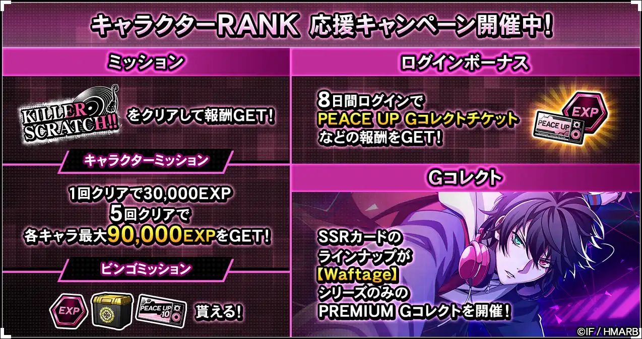 期間中、キャラクターRANK EXPを各キャラクター最大90,000獲得できるキャラクターミッションをはじめ、ビンゴミッションやログインボーナスを開催しています。期間中、8日間ログインで「PEACE UP Gコレクトチケット」などの報酬を入手できます。詳細はアプリ内お知らせをご確認ください。 |