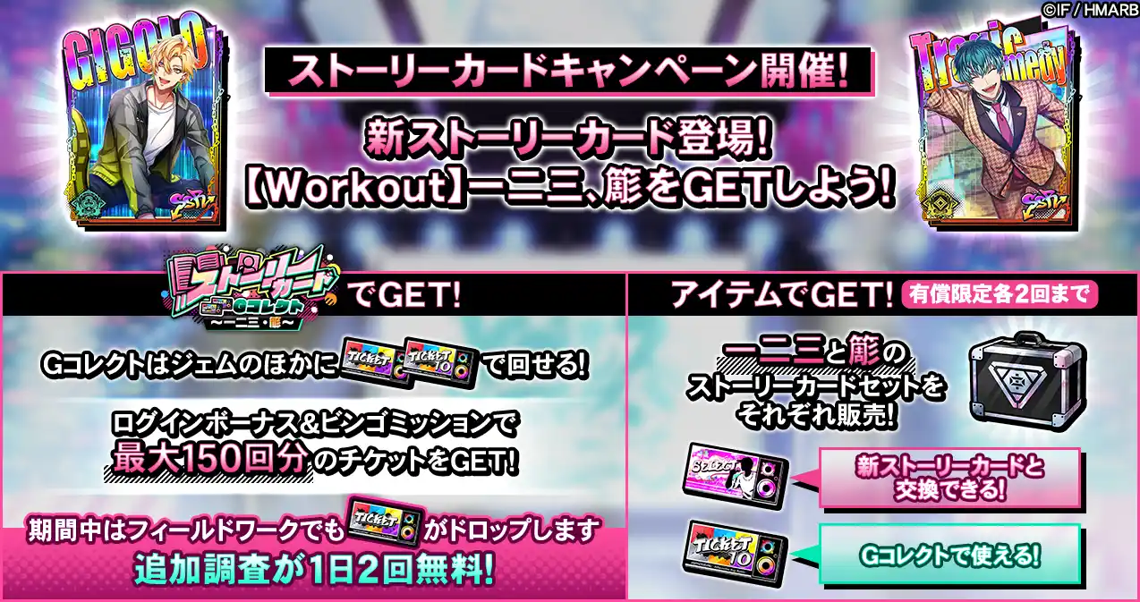 新ストーリーカード「SSR【Workout】伊弉冉一二三」と「SSR【Workout】白膠木簓」を獲得することができるGコレクトを開催しています。Gコレクトはジェムのほか、専用チケット「ストーリーGコレチケット(vol.6)」各種を使うことでも回すことができ、ビンゴミッションとログインボーナスで最大150回分のチケットを獲得できます。 |