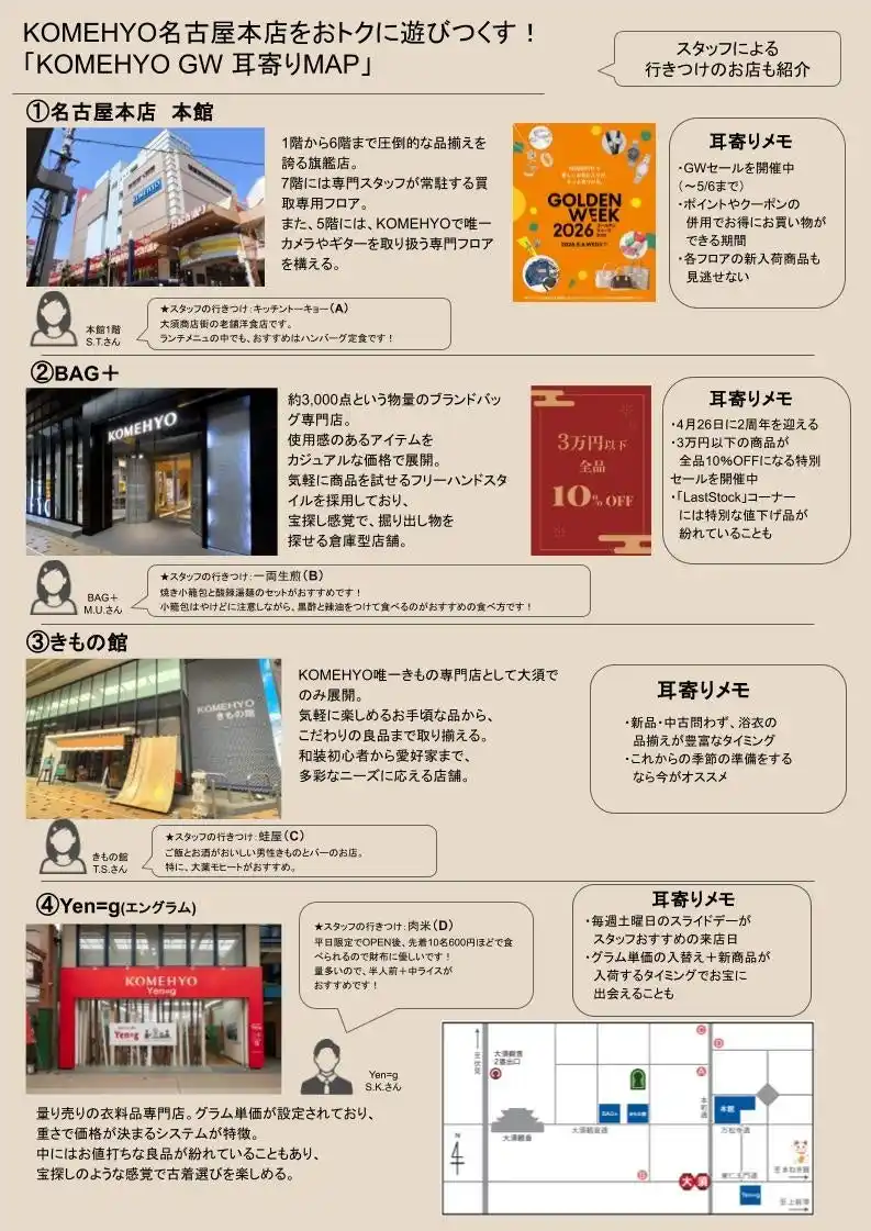 株式会社コメ兵(本社所在地:愛知県名古屋市、代表取締役社長:山内 祐也)は、名古屋市、大須にあるKOMEHYO名古屋本店の4つの店舗(名古屋本館、BAG+、きもの館、Yen₌g)のゴールデンウィーク関連情報を1枚に集約した「KOMEHYO GW 耳よりMAP」を制作いたしました。 |