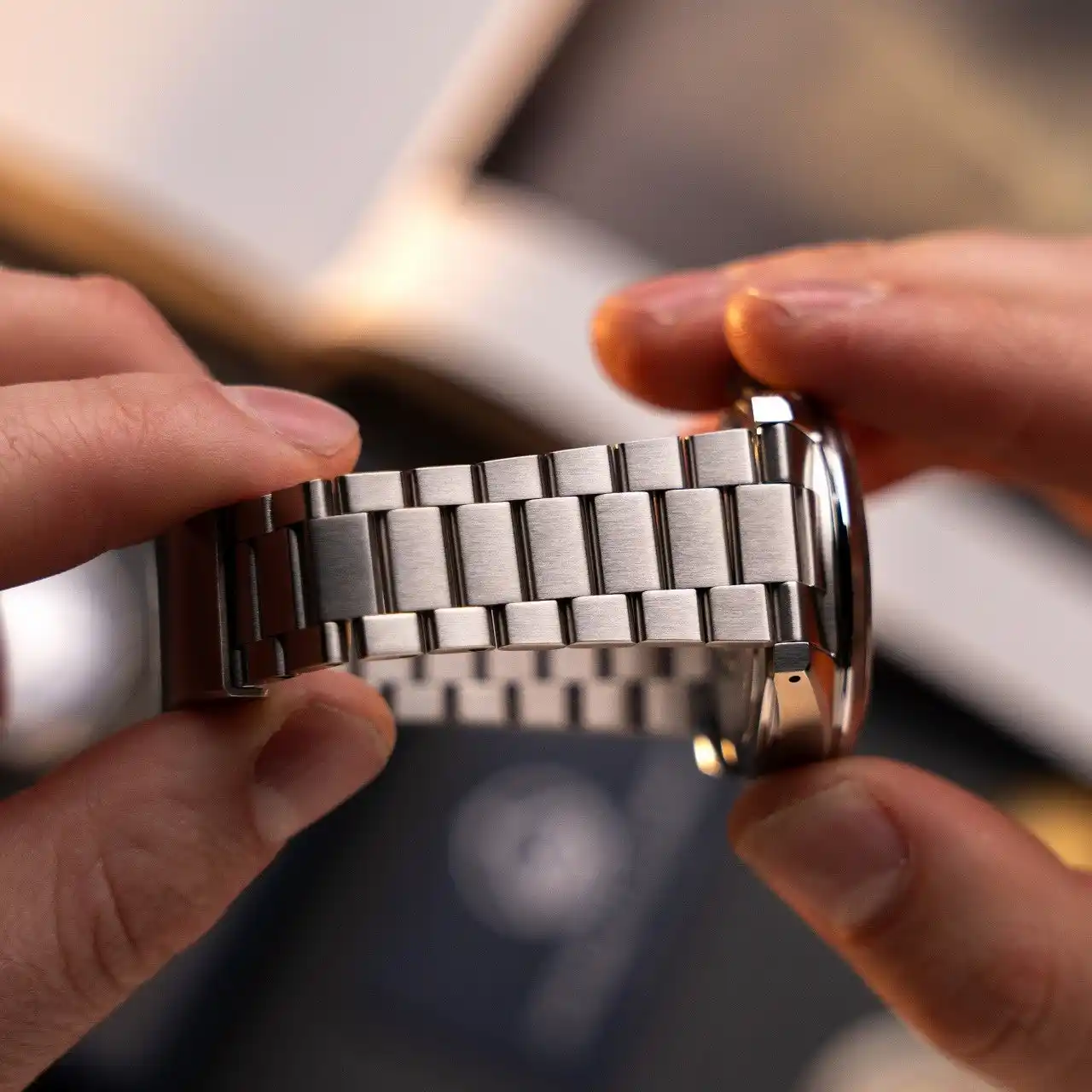 | ケース径38.5mm・ラグ・トゥ・ラグ47.0mmというサイズ感は、精緻に計算されたプロポーションです。主張しすぎず、しかし確かな存在感を持つバランスに仕上がっており、初めて機械式時計を検討されるお客様にも、時計愛好家の方にも、自信を持ってお薦めできます。 | |||||||||||||||||||