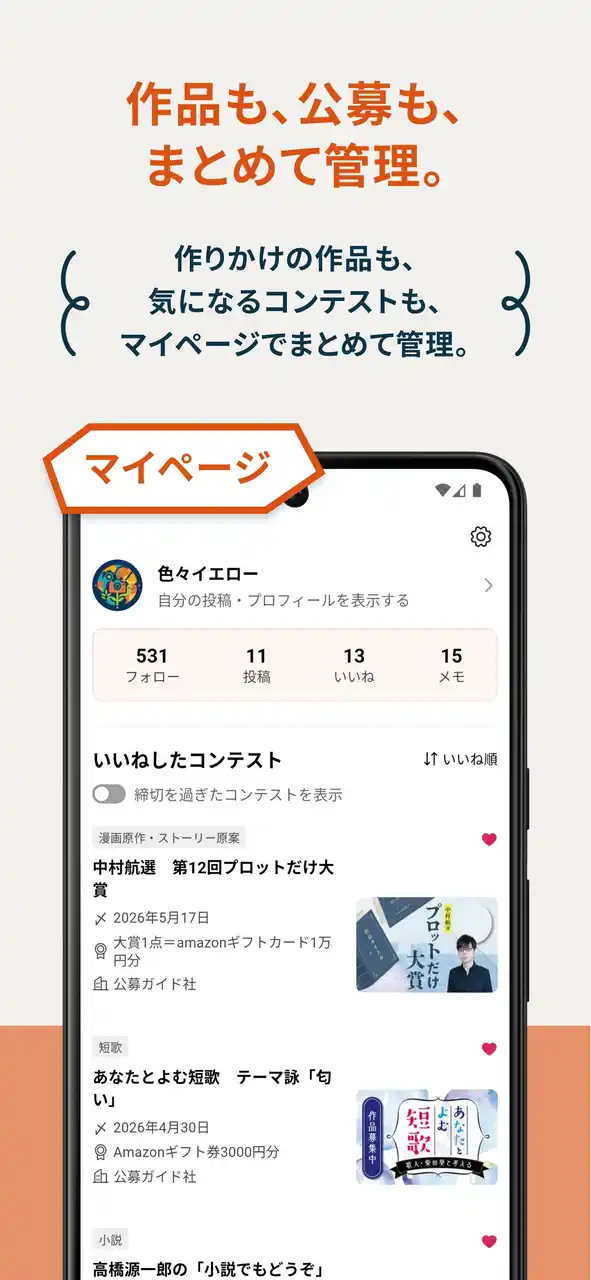 お気に入りのコンテスト、自分の投稿・いいね・メモをまとめて確認。作りかけの作品も気になるコンテストもここで一括管理。 |