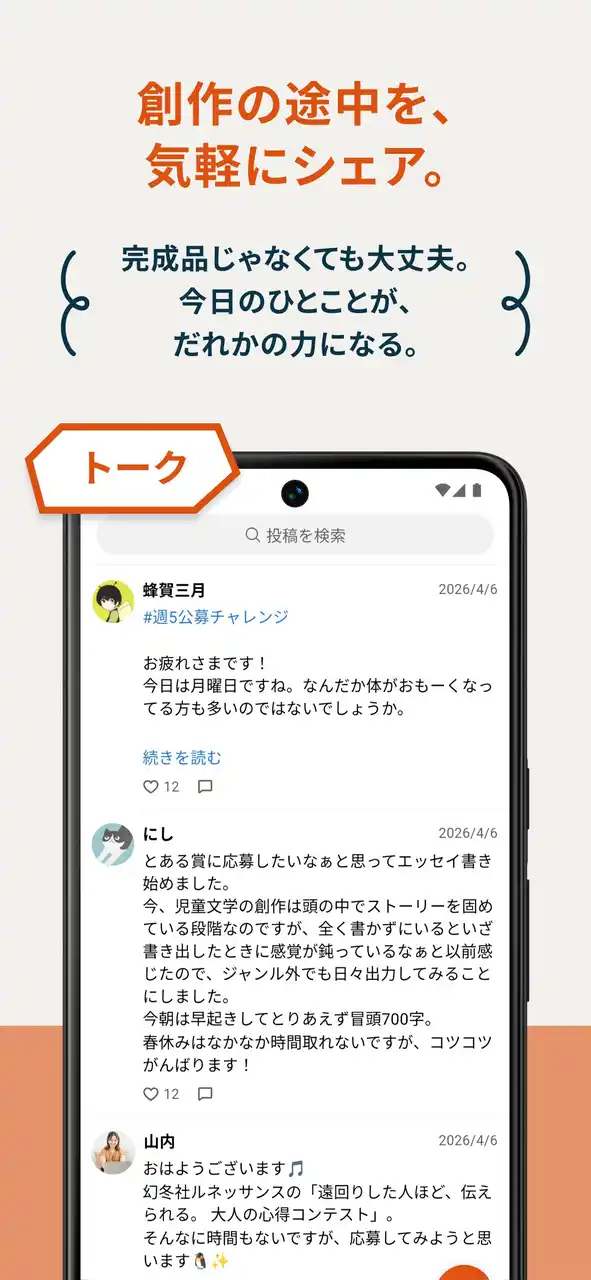 完成品じゃなくても大丈夫。創作の途中を気軽にシェア |