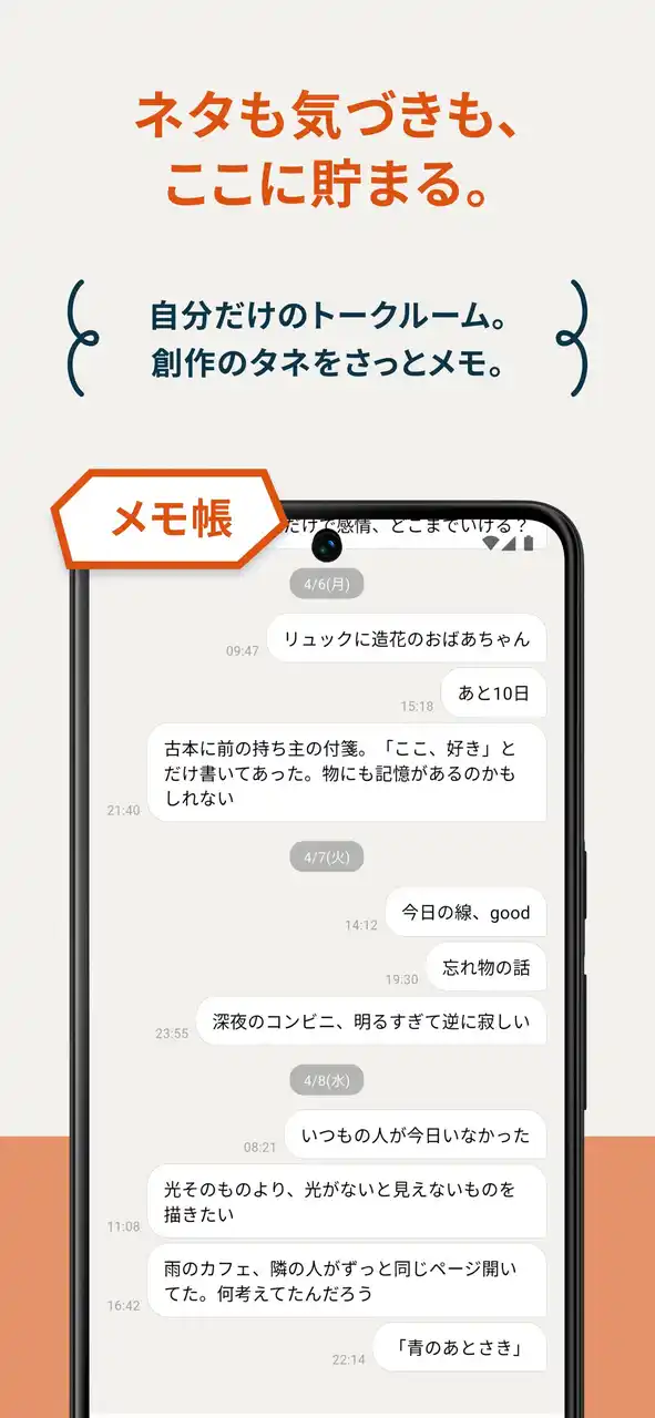 自分だけのトークルーム形式で、テキストメモ・URL保存・写真保存が可能。創作のネタやアイデアを蓄積する個人スペース。 |
