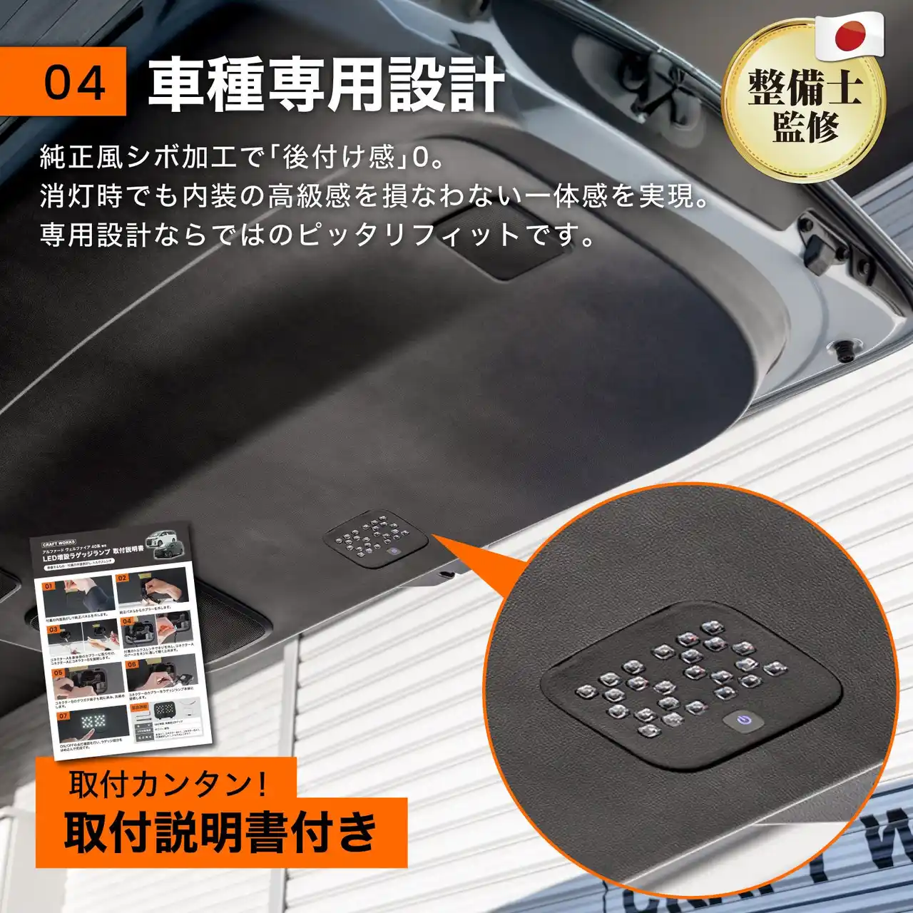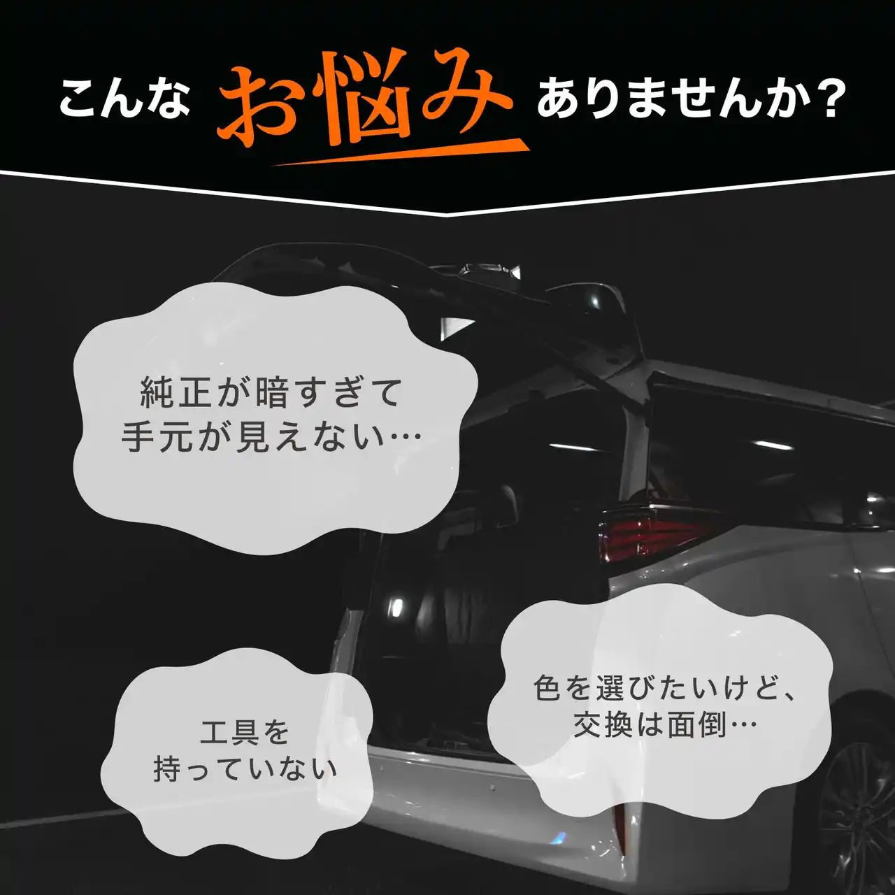 | 一方で、「純正ラゲッジランプが暗く、夜間の積み下ろしや荷物の探し物に不便を感じる」「色味を変えたいが、電球交換は手間がかかる」といったユーザーの声が多く寄せられていました。 | |||||||||||||||