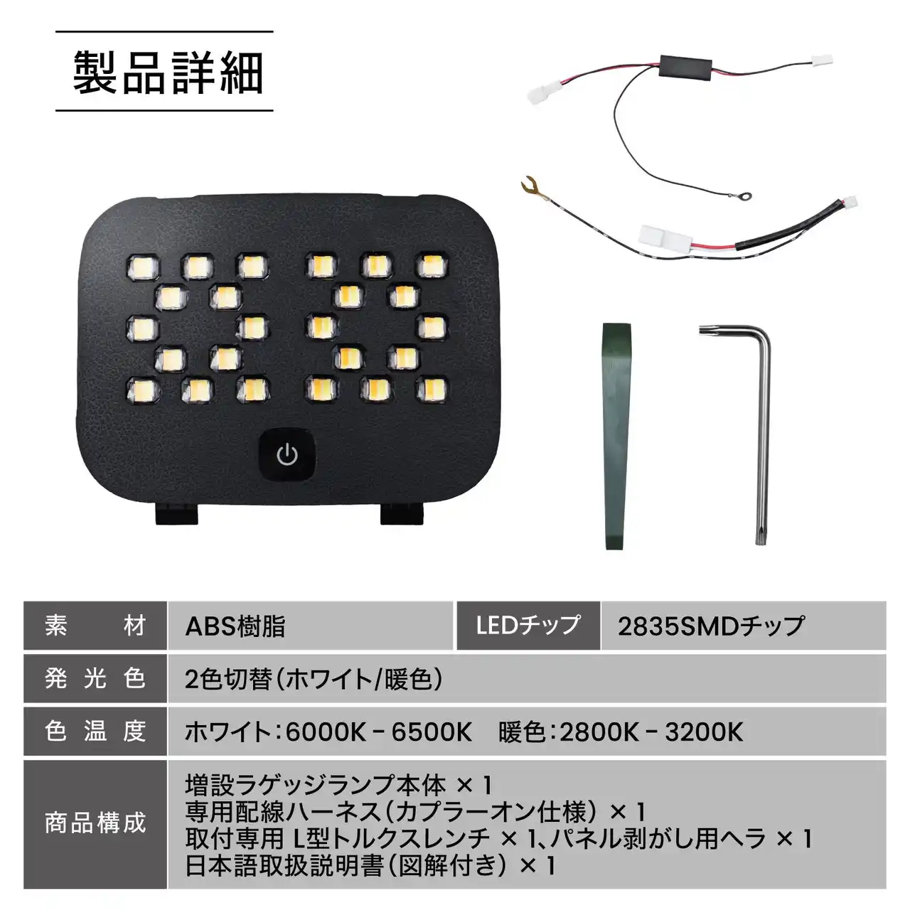 [製品詳細] 素材:ABS樹脂 LEDチップ:2835SMDチップ 発行色:2色切替(ホワイト/暖色) 色温度:ホワイト:6000K-6500K 暖色:2800K-3200K 商品構成:増設ラゲッジランプ本体 ×1 専用配線ハーネス(カプラーオン仕様)×1 取付専用L型トルクスレンチ ×1、パネル剥がし用ヘラ ×1 日本語取扱説明書(図解付き) ×1 注意)年式・グレード・オプション等により適合しない場合があります。 形状をご確認いただいた上、お買い求めください。 |
