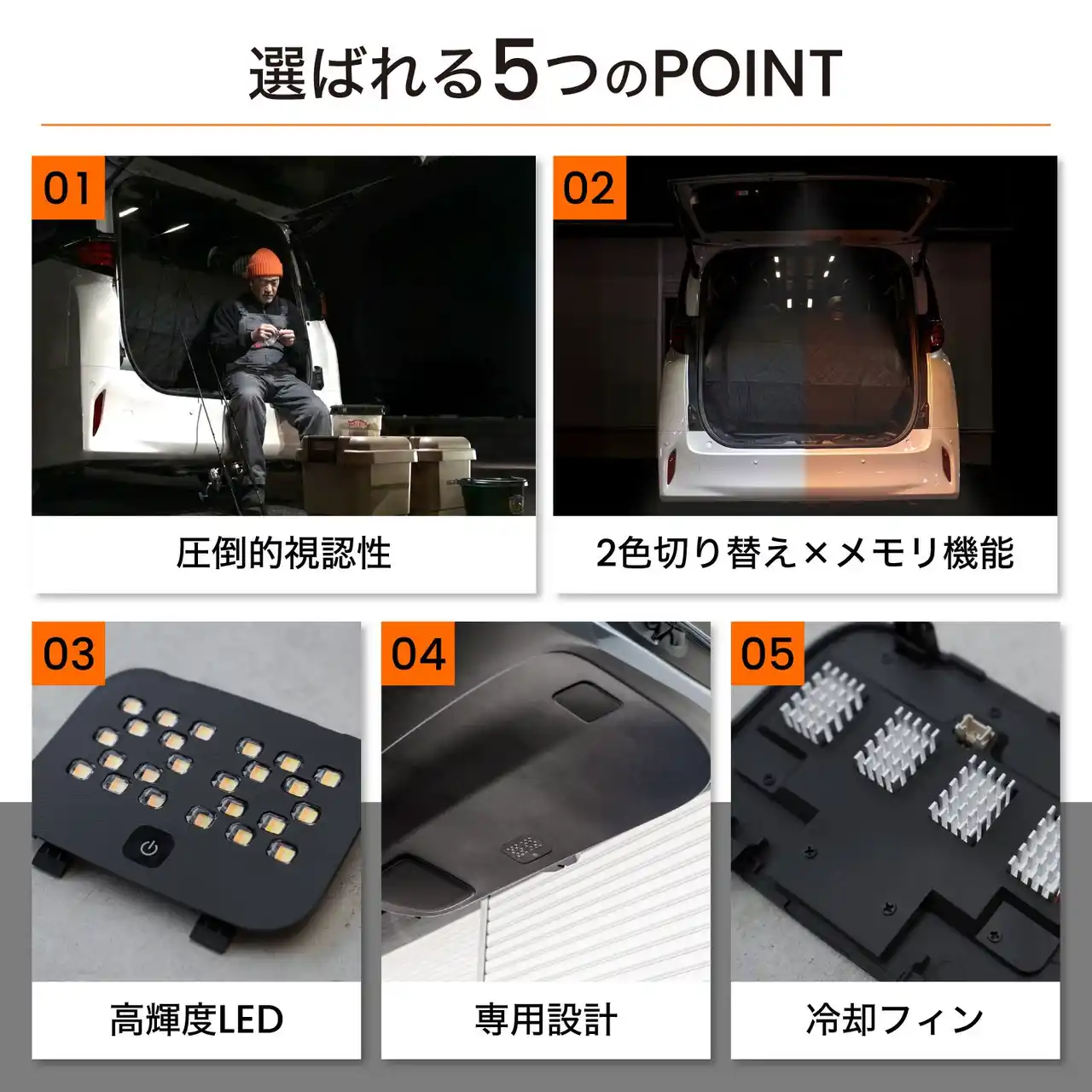 | 広範囲を均一に照らす高輝度LEDを採用し、ホワイトと暖色の2色切り替えに対応。前回設定を保持するメモリ機能や冷却フィン構造、純正風シボ加工の専用設計により、使いやすさと内装になじむ一体感を追求しました |