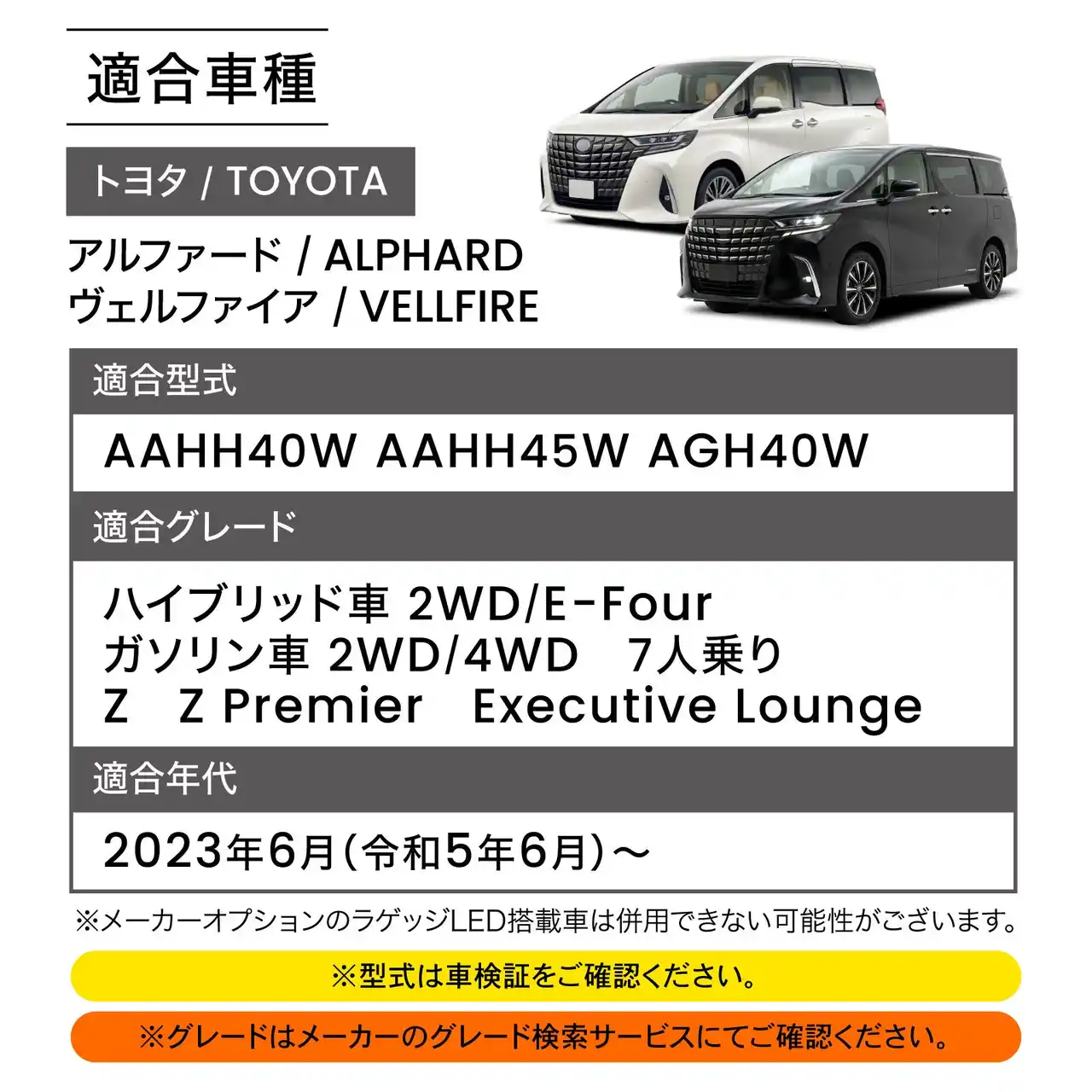 [適合車種] トヨタ / TOYOTA アルファード / ALPHARD ヴェルファイア / VELLFIRE [適合型式] AAHH40W AAHH45W AGH40W [適合グレード] ハイブリッド車 2WD/E-Four ガソリン車 2WD/4WD 7人乗り Z Z Premier Executive Lounge [適合年代] 2023年6月(令和5年6月)~ ※メーカーオプションのラゲッジLED搭載車は併用できない可能性がございます。 ※型式は車検証をご確認ください。 ※グレードはメーカーのグレード検索サービスにてご確認ください。 |
