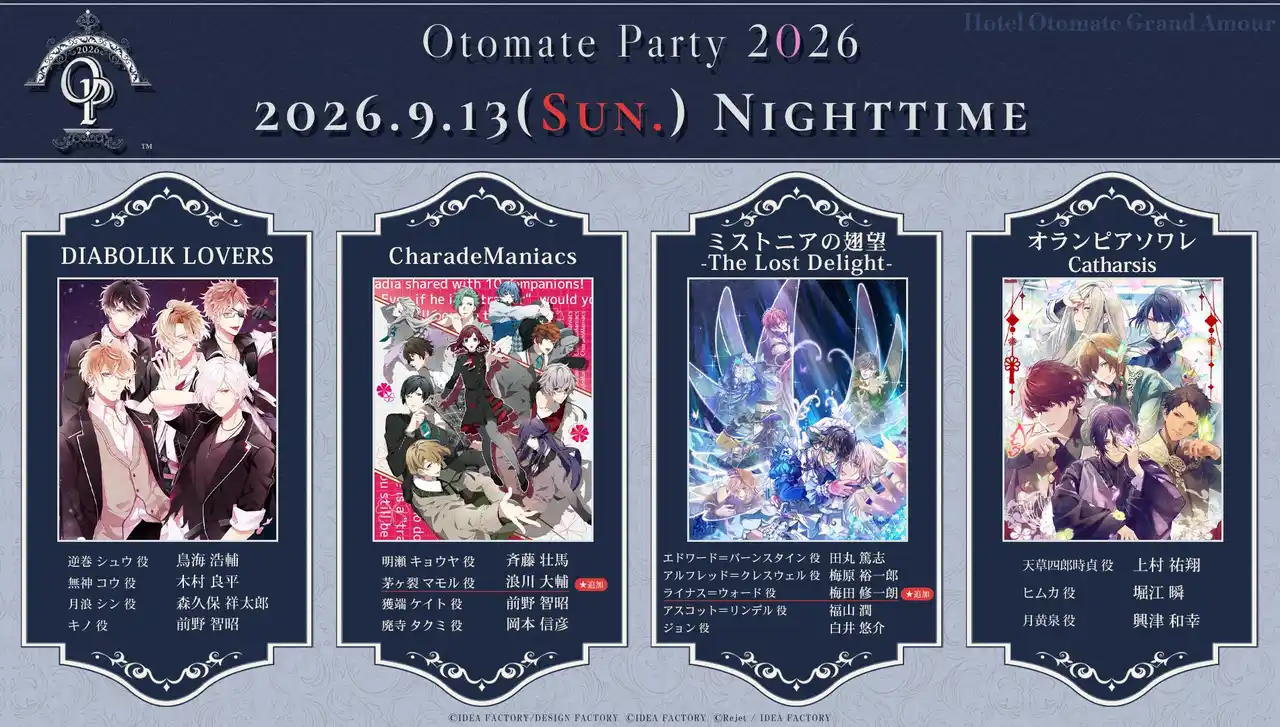 | アイディアファクトリー株式会社(代表取締役社長:佐藤 嘉晃/所在地:東京都豊島区)の女性向けゲームブランド「オトメイト」は、2026年9月12日(土)・13日(日)に東京国際フォームラム ホールAにて開催する「オトメイトパーティー2026」の追加出演キャストとして【浪川 大輔さん】と【梅田 修一朗さん】の2名を発表いたしました。 | |||