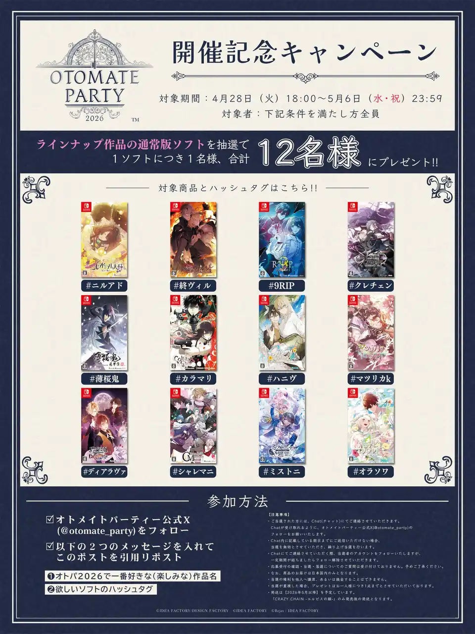 | 「オトメイトパーティー2026」のイベント開催を記念して、オトメイトパーティー公式X(旧Twitter)にて、本イベントラインナップ作品のゲームソフト(通常版)を抽選で【12名様】にプレゼントするキャンペーンを開始いたしました! | |||