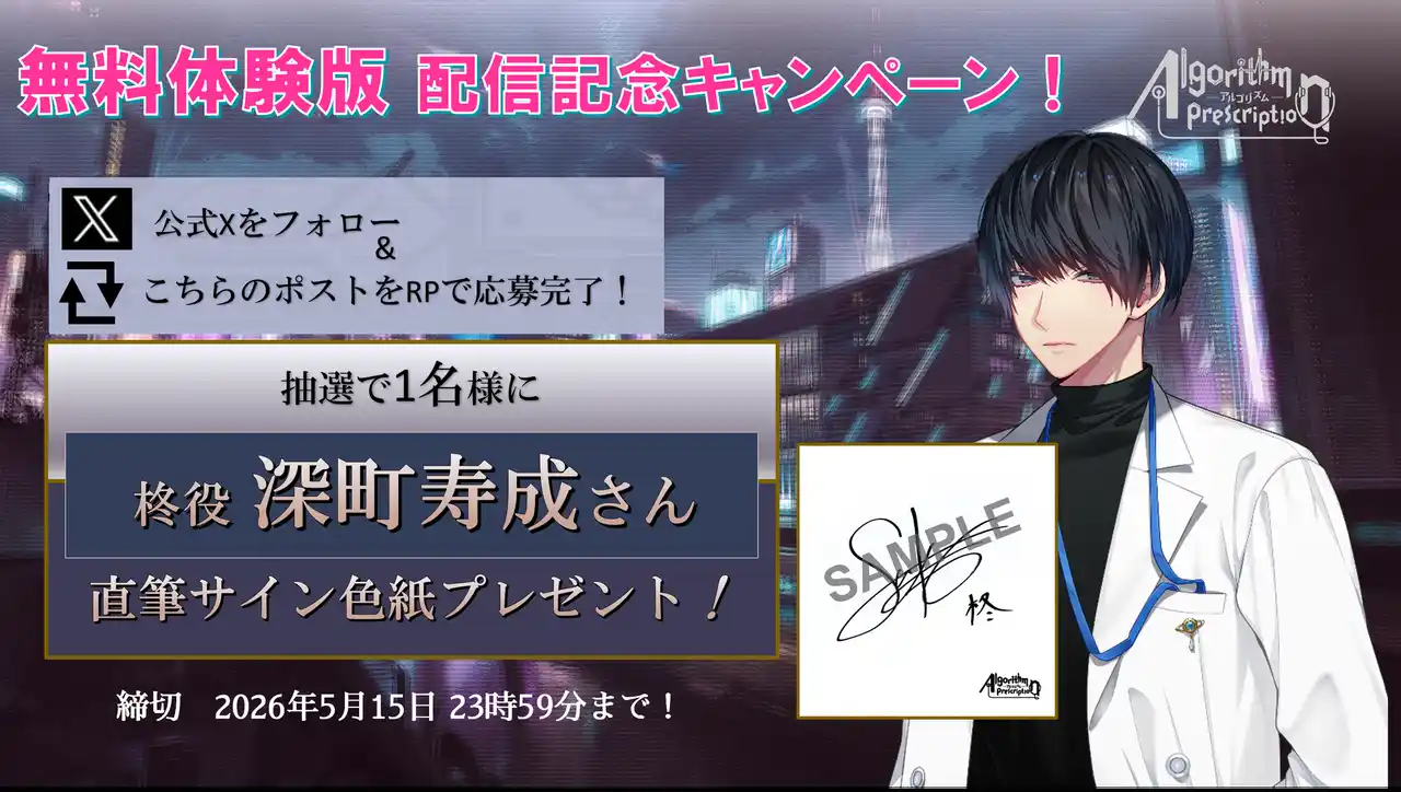 『アルプレ【公式】Algorithm Prescription』X(https://x.com/algorithm_pre )では無料体験版の配信を記念して、攻略対象3名の声優を務める深町寿成さん、石谷春貴さん、土岐隼一さんのサインをプレゼントするキャンペーンを開始いたしました。応募詳細については公式Xをご確認ください。 |