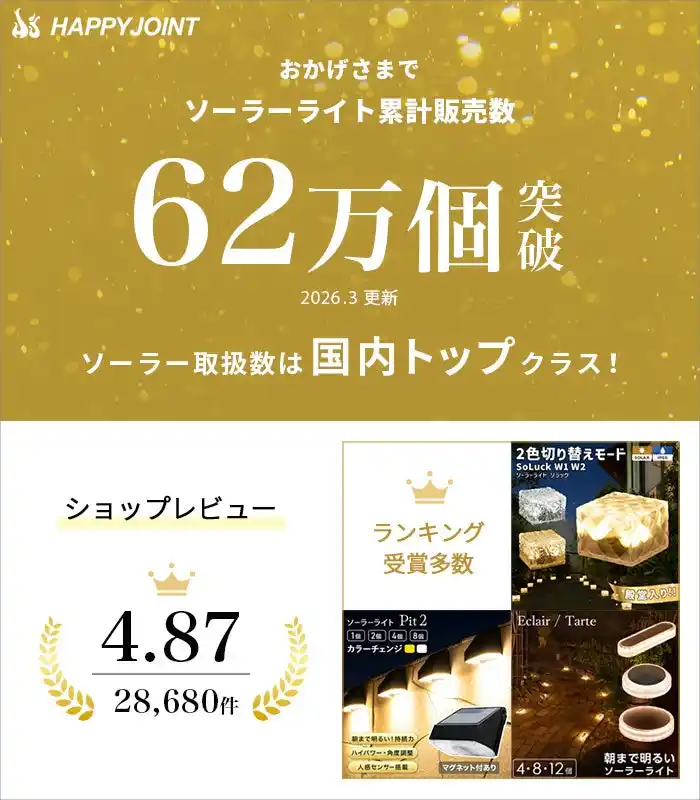 株式会社 HAPPYJOINT は、2006年に設立しました。ECサイトにて光り物を軸に安全グッズやソーラーライトなどの外構照明・インテリア照明を展開し販売しております。仕入れ、撮影、制作、検品、出荷、カスタマーサービスまで、お客様に感謝と感動をお届けいたします。
