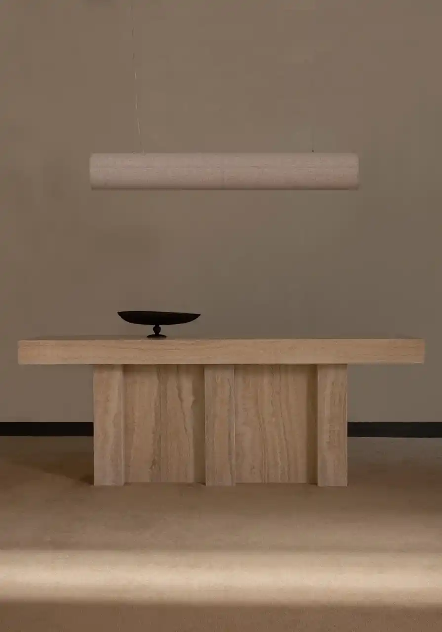 円柱形のフォルムに、静けさとプロポーション、シンプルさと個性の絶妙なバランスを映し出しています。素材には、ウッドとリネンを採用。計算された異素材の組み合わせにより、空間にやわらかな光と、ほのかな質感をもたらします。 |