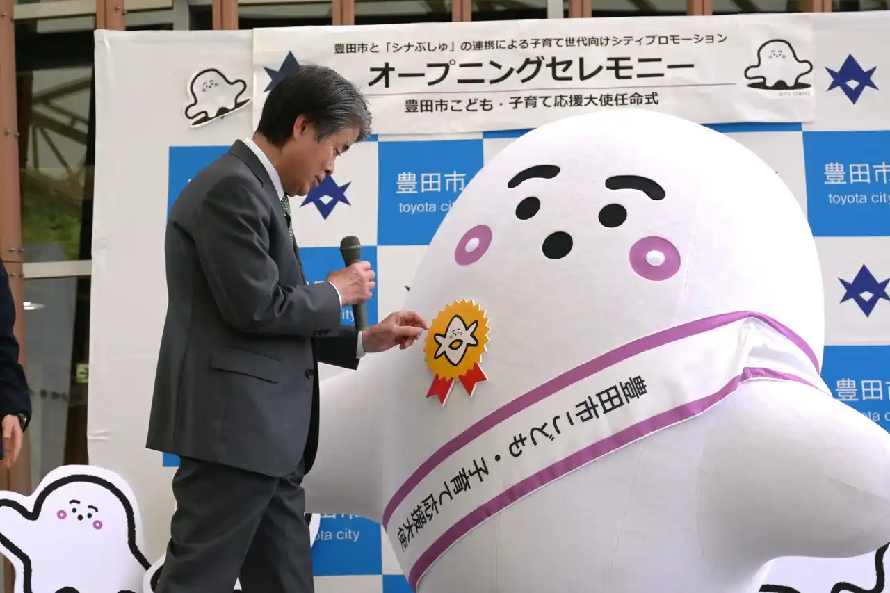 豊田市こども・子育て応援大使のバッジをつけてもらうぷしゅぷしゅ |