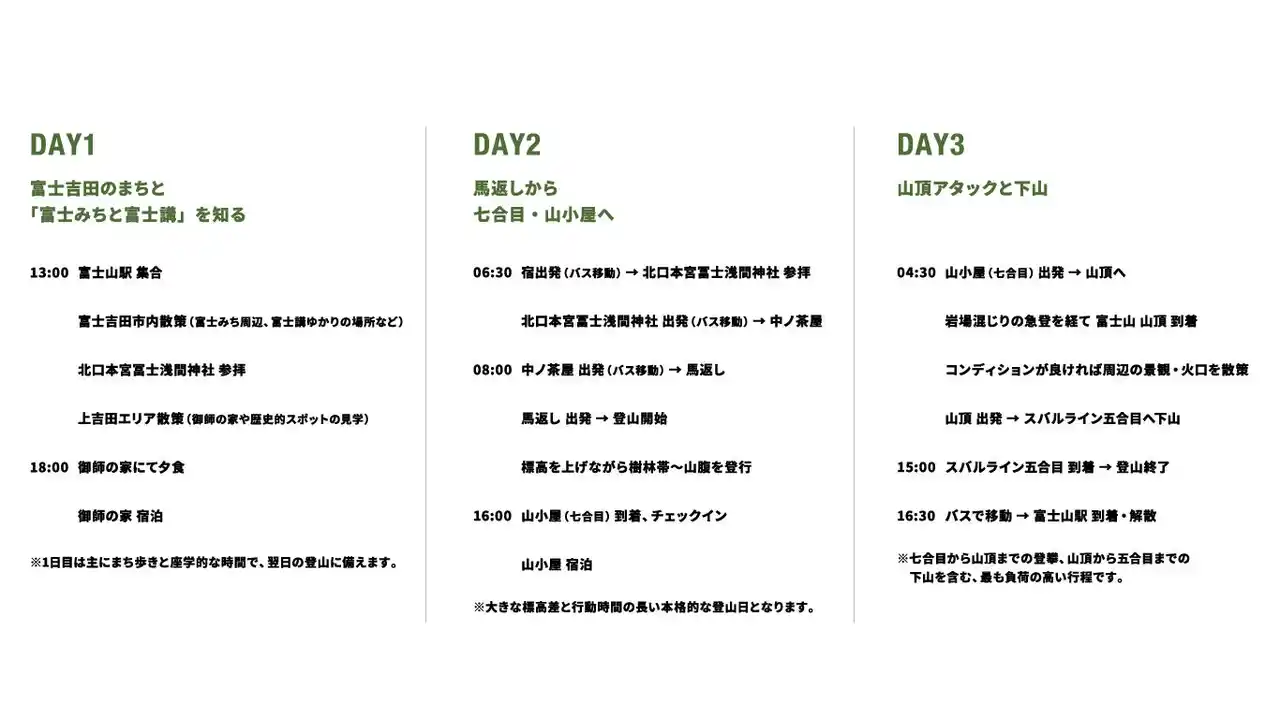北口本宮冨士浅間神社や御師の家を訪ね、かつての人々がどのような思いでこの山を目指したのか、道を辿る前にその背景に触れる時間を過ごします。2日目以降は「富士みち」を実際に辿り、学んだ歴史や背景を照らし合わせながら富士山の頂きを目指します。 |