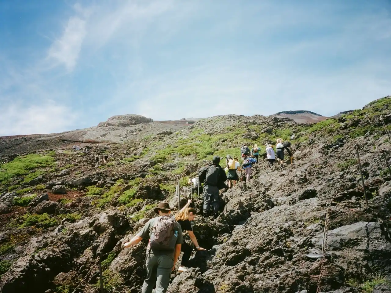 馬返しから七合目、山頂へと向かうルートは大きな標高差と行動時間の長さからしっかりとした登山経験と体力が求められます。樹林帯から岩場混じりの急登まで、気温や路面状況などの環境変化の激しい登山道を一歩ずつ登り、さらに山頂から五合目までの長い下りを歩ききることで、3,000m峰登山ならではの達成感を味わう行程となります。経験豊富な登山ガイドが同行し、安全管理とペースメイクをサポートしながら参加者様一人ひとりの歩みに寄り添います。 |