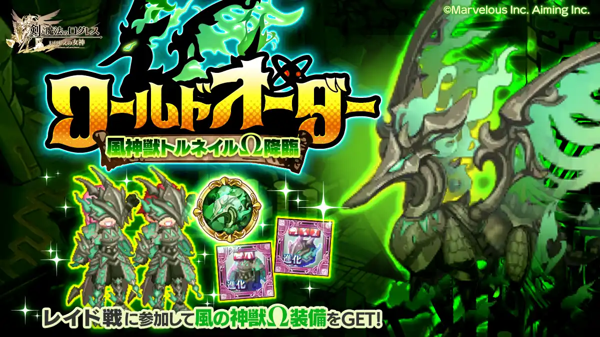 レイド戦で風神獣トルネイルΩに挑み、潜在能力解放が可能な「神獣トルネイルΩの覇装」などの報酬をGETしよう! |
