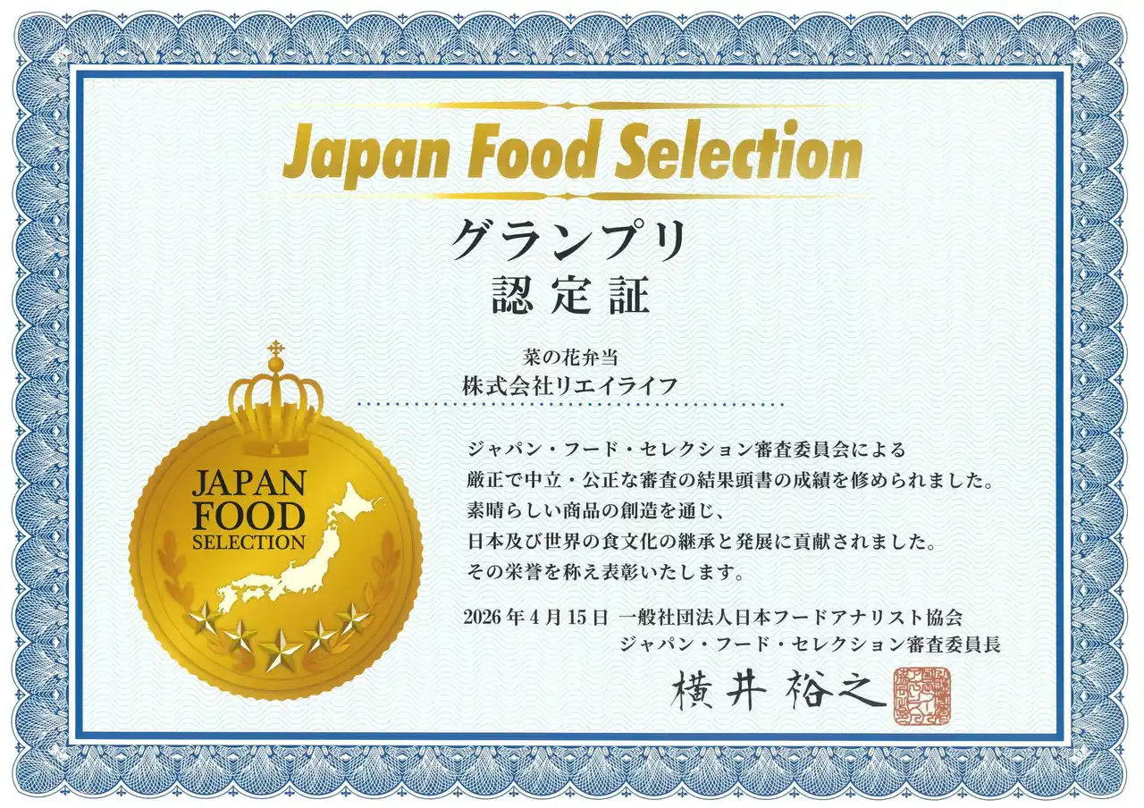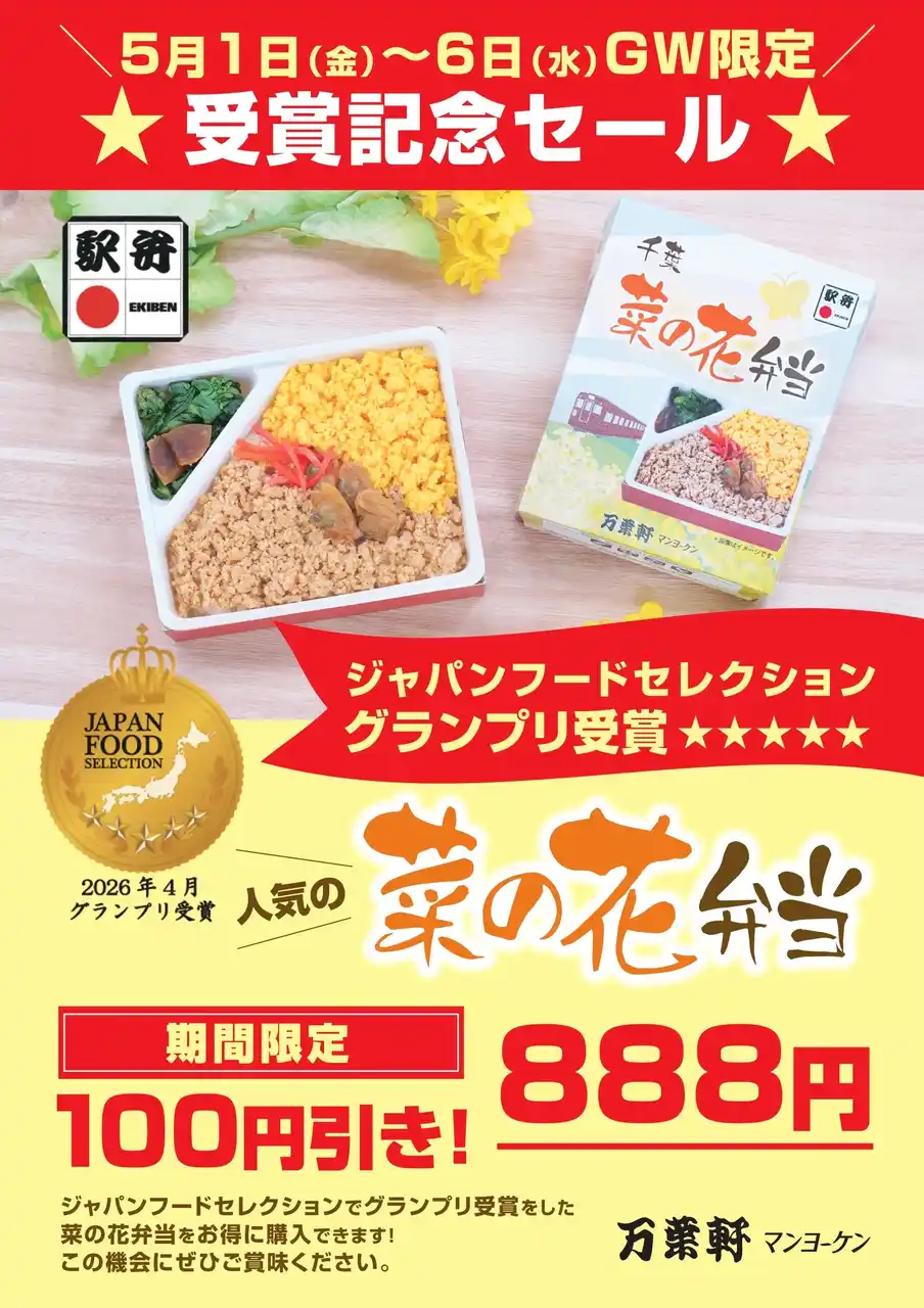 リエイグループの株式会社リエイライフ(本社:千葉県浦安市、代表取締役社長:椛澤 大樹)が展開する千葉県の老舗駅弁ブランド「マンヨーケン(万葉軒)」は、2026年4月度の第98回「ジャパン・フード・セレクション」において、当社のロングセラー駅弁『菜の花弁当』が、最高評価であるグランプリを受賞しました。 これを記念し、ゴールデンウイーク期間中の2026年5月1日(金)~5月6日(水・祝)までの6日間、特別価格888円(税込)でお買い求めいただける記念セールを開催いたします。 |