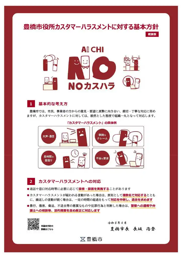 | こうした中、豊橋市はカスハラから職員を守り、毅然とした態度で組織一丸となって対応するため、市の対応などを示した「豊橋市役所カスタマーハラスメントに対する基本方針」をまとめ、2026年4月から市役所の窓口などに掲示しています。 | |||||||||