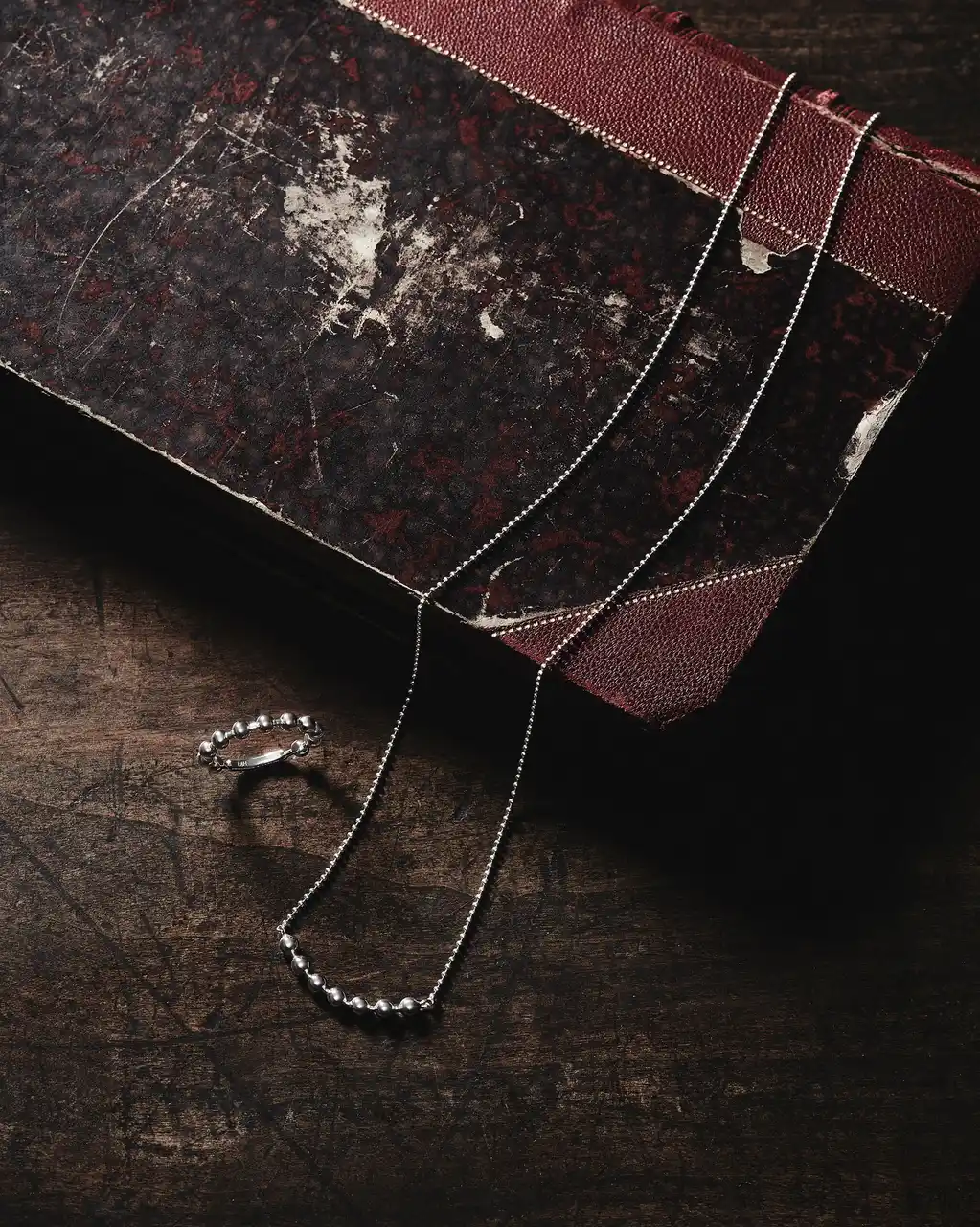 編み込んで作られたチェーンとは異なる、艶やかですっきりとした表情が魅力のボールチェーンは、カジュアルな一面とモダンな印象を併せ持ち、スタイリングにエッジの効いた新鮮な魅力をプラスします。 |