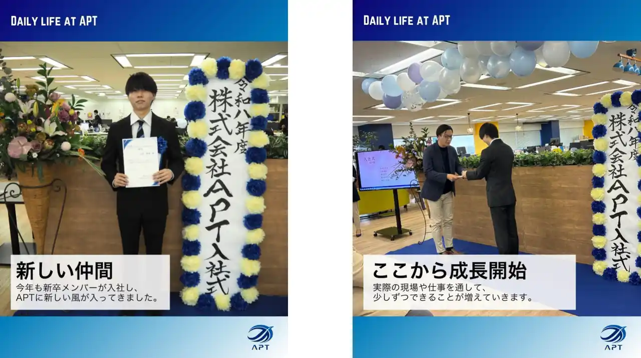 本年度、APTは志を共にする1名の新卒社員を迎えました。入社式を終え、現在は現場実務を深く理解するための「新卒採用研修」および、早期の活躍を支援する「オンボーディングプログラム」が本格的にスタートしています。 APTでは、過去数年間にわたり「一人ひとりと向き合い、次世代のリーダーを育てる」という方針のもと、あえて大人数ではなく厳選して1名~数名の新卒採用を継続してきました。この徹底した少数精鋭の文化が組織の質を高め、現在では全従業員数約80名まで成長を遂げています。 |