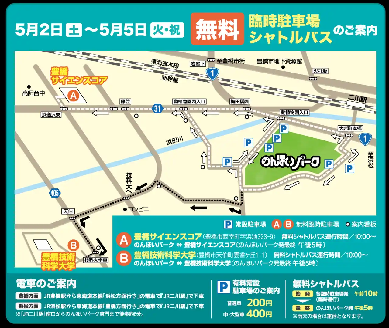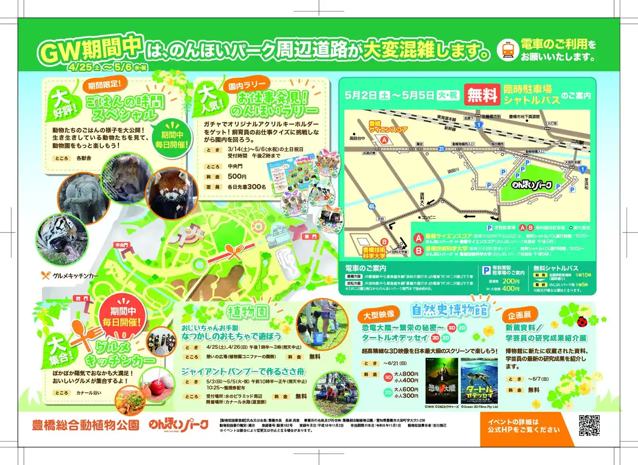 GW期間中、のんほいパーク周辺は大変混雑します。5月2日(土)~5月5日(火・祝)の期間に、お車でお越しの場合は、豊橋サイエンスコア及び豊橋技術科学大学に開設される無料の臨時駐車場もぜひご利用ください。 無料臨時駐車場では、無料シャトルバスの送迎も行います(雨天運休)。 |
