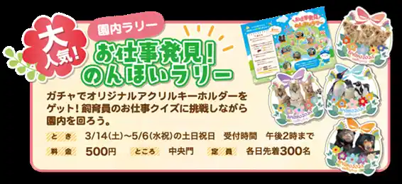 子どもたちに大人気の、500円のワンコインで楽しめる園内ラリー。飼育員のお仕事クイズに挑戦しながら園内を回ってみませんか?スタート時にはガチャでオリジナルのどうぶつキーホルダーをゲ |