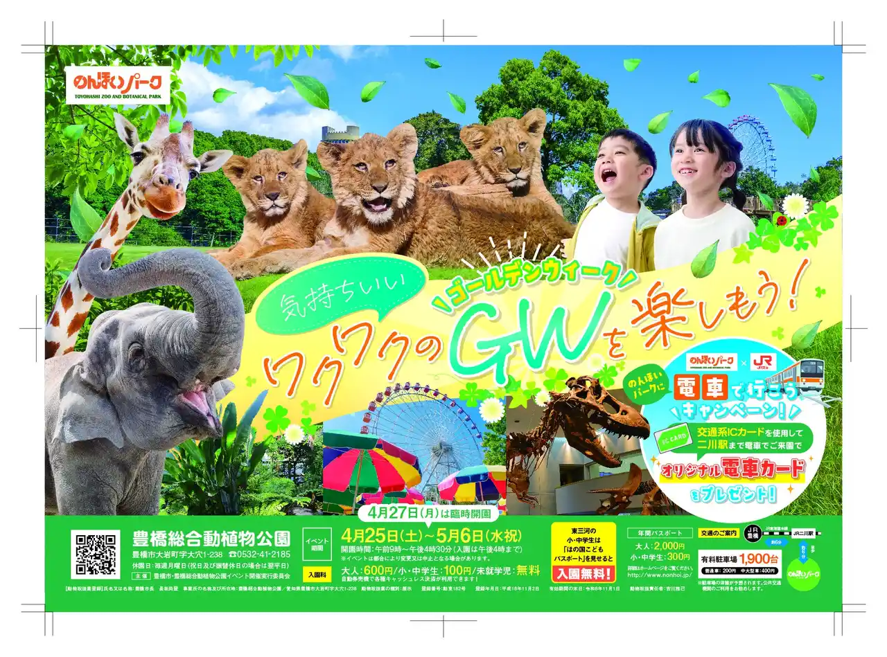 二川駅から徒歩約6分。GWは渋滞を回避して、電車でのんほいパークに行ってみよう!のんほいパークでは、JR 東海とコラボキャンペーンを開催中。二川駅までJR 東海道線にて交通系 IC カードをご利用の上、ご来園された方に「のんほいパーク×JR東海コラボカード」を、のんほいパークの東門にてプレゼントしています。ぜひ渋滞知らずの電車でお越しいただき、電車カードをゲットしてね。 |