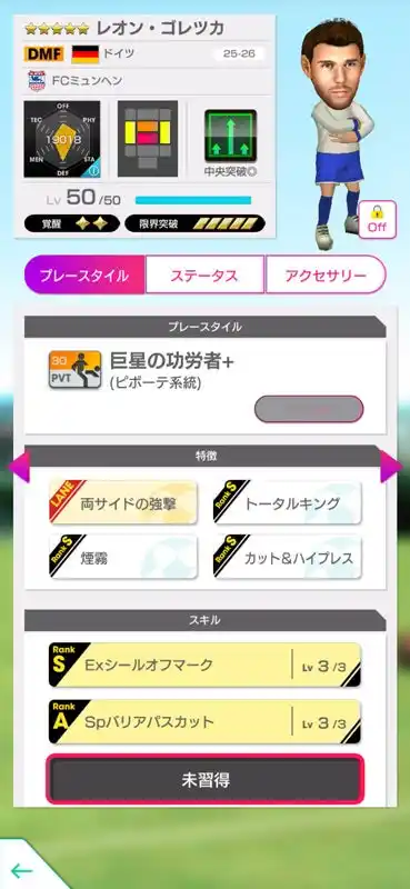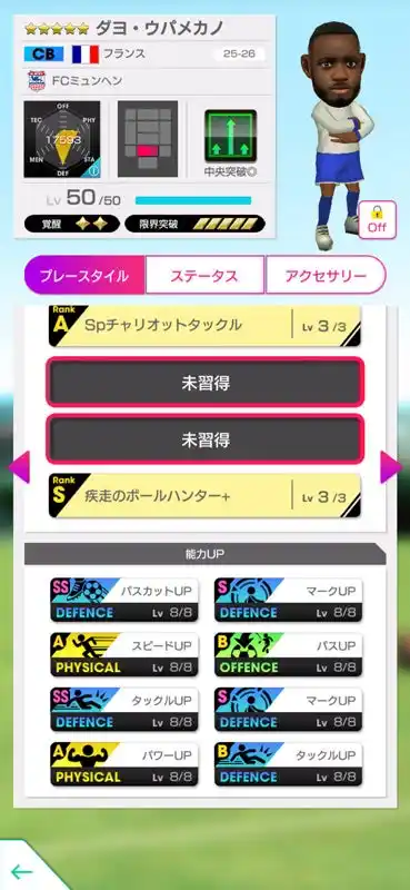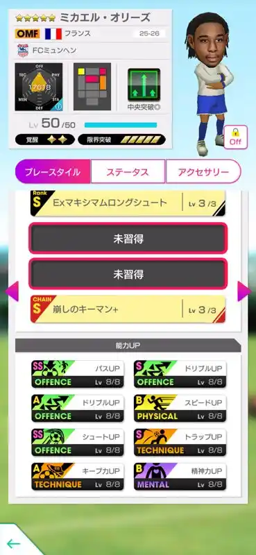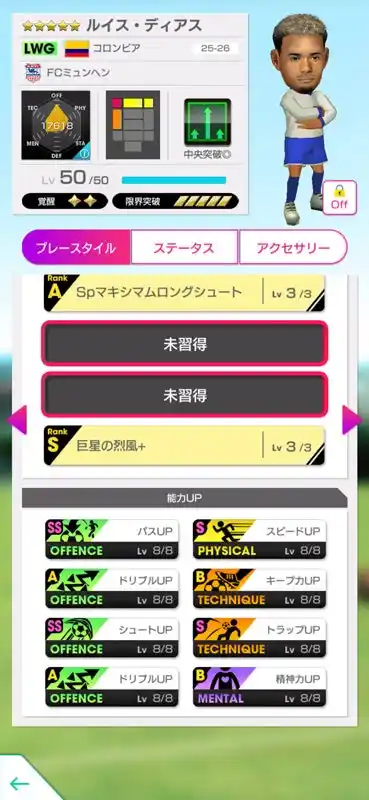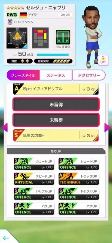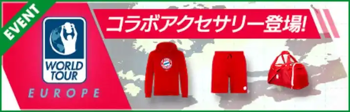 また、難易度「ベリーハード」の各ステージでは、選手の能力をアップさせるアクセサリーが入手できます。最終ステージではFCバイエルン・ミュンヘンとコラボした「バイエルン」の虹アクセサリーが登場! 過去に登場したワールドツアー限定の虹アクセサリー「金糸雀」「伝統」も再登場します。 |