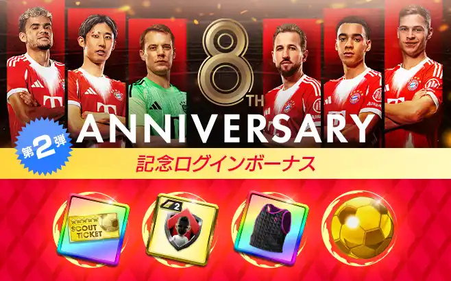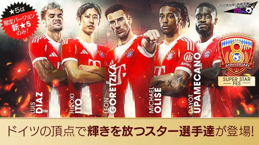 「ルイス・ディアス」「セルジュ・ニャブリ」「ミカエル・オリーズ」「レオン・ゴレツカ」「伊藤洋輝」「ダヨ・ウパメカノ」「ヨナス・ウルビヒ」といったFCバイエルン・ミュンヘンのスーパースターが、得意戦術中央突破の新★5選手として登場する“8th Anniversary SUPER STAR FES”を開催!★4バージョンの選手たちがもらえる“スペシャルログインボーナス”も実施します。 |