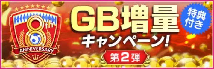 “8th Anniversary GB増量キャンペーン第2弾”を開催中です。GBショップで指定のGBセットを購入すると、特典としてGB増量やアイテムが付いてくるお得なキャンペーンです。 |