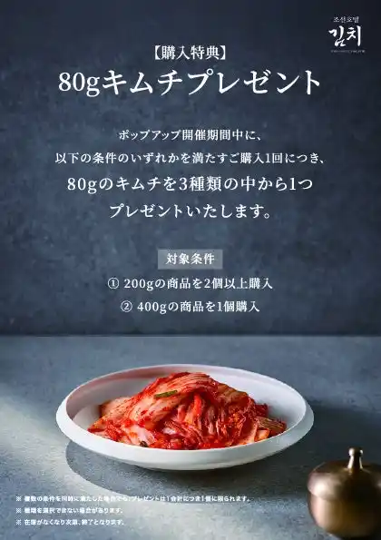 ポップアップ開催期間中、下記いずれかの条件を満たしたご購入1会計につき、80g キムチを3種類の中から1個プレゼントいたします。 |
