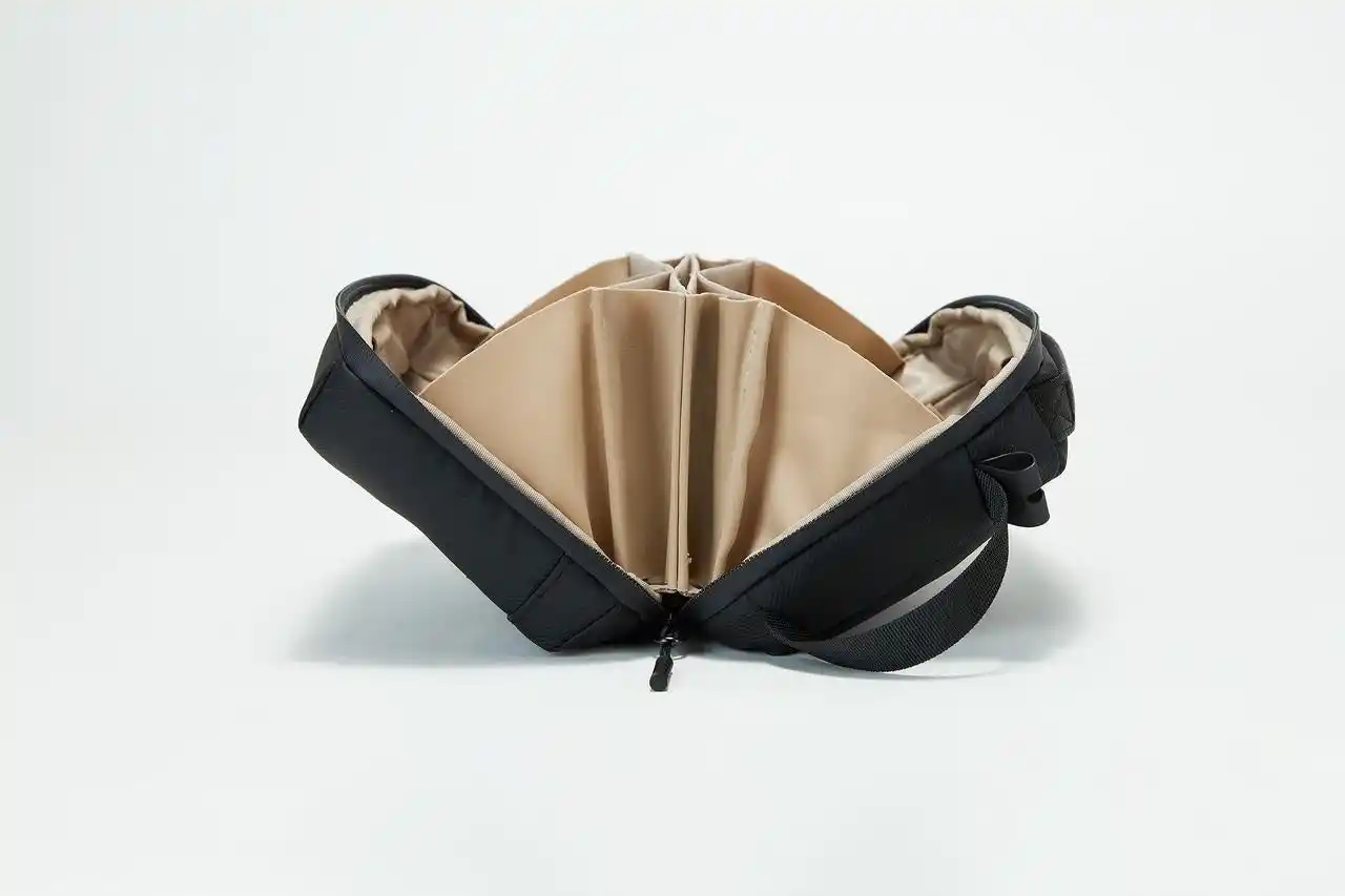 (3)選び抜かれた素材 大切なガジェットを守るため、耐摩耗・防傷・撥水仕様の外装と、型崩れを防ぐ硬質芯材、立体エアクッション素材の内装。毎日使い続けることを前提に設計しました。 |