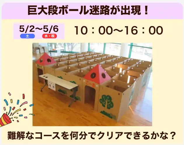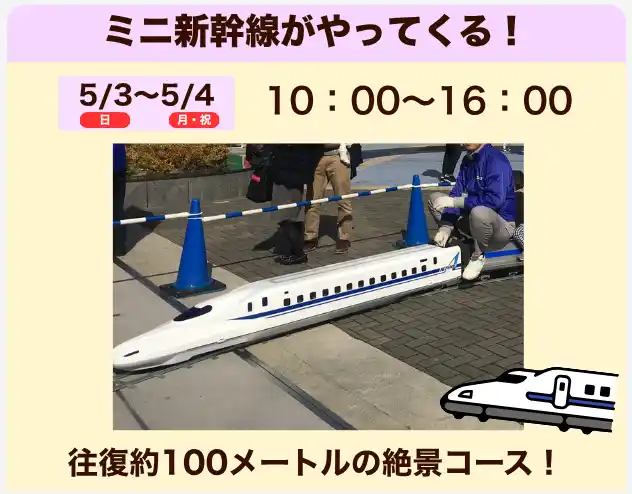 ・巨大段ボール迷路(5月2日~6日)1回 200円 ・ミニ新幹線運行(5月3日・4日)1回 300円 |