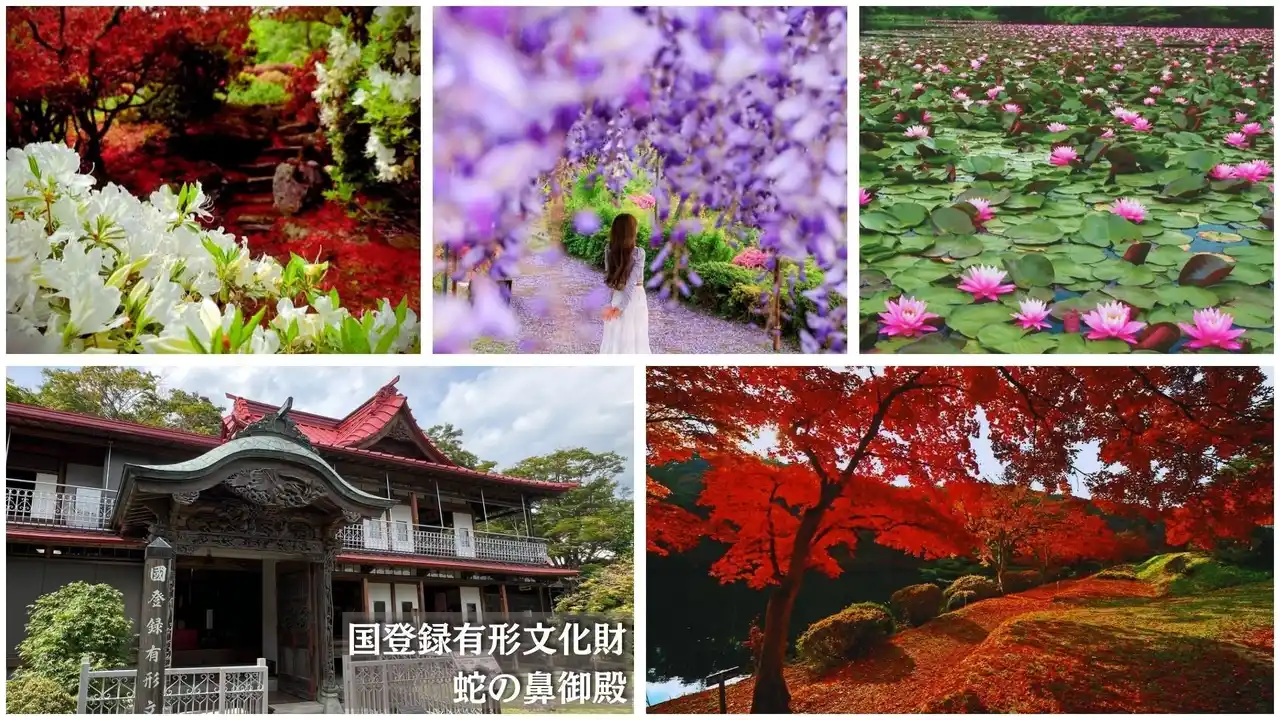 「花と歴史の郷 蛇の鼻」は、福島県本宮市にある観光庭園です。約10万坪(東京ドーム約7個分)の広大な敷地が広がり、四季折々の花々を楽しめます。春はサクラから始まり、フジ、ツツジ、ボタン、バラ、スイレンへと見頃が移ろい、園内を華やかに彩ります。中でも、本宮市の天然記念物に指定されている全長約80メートル超の大フジ棚は、見頃の時期には一面に花房が垂れ下がり、訪れる人々を魅了します。また、秋には400本を超えるモミジが庭園全体を包み込み、季節ごとに異なる表情を見せます。広大な園内では、自然の美しさに触れながら、ゆったりとした時間を過ごすことができます。 |