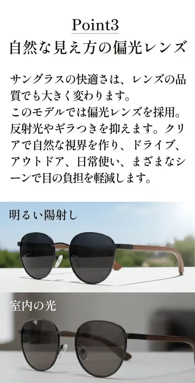 単にまぶしさを軽減するだけでなく、景色や対象物をより自然に見やすく調整されています。ドライブ、アウトドア、街歩きなど、さまざまなシーンで活躍します。 |